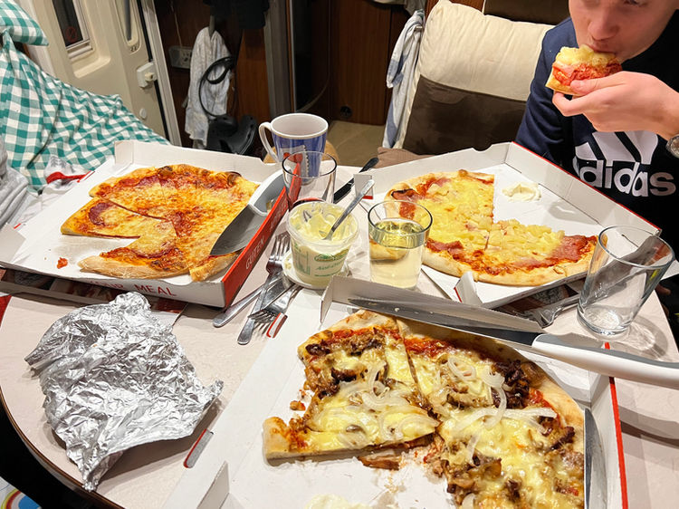 Das Essen schmeckt nicht jedem und alle schaffen ihr Essen auch nicht. Vor allem die Pizzen sind auch riesig. Marlena schafft ihre nicht, Jonas schmeckt seine nicht so besonders und auch meine Frau hat mit der Menge vom Dürum so ihre Probleme. So bleibt was für morgen übrig. Der Abend endet wie die bisherigen Abende. Ich schreibe schnell den Block, die Kinder bereiten den Spieleabend vor. Ich brauche noch Revanche in Rommé. Wurde bisher immer abgezockt.