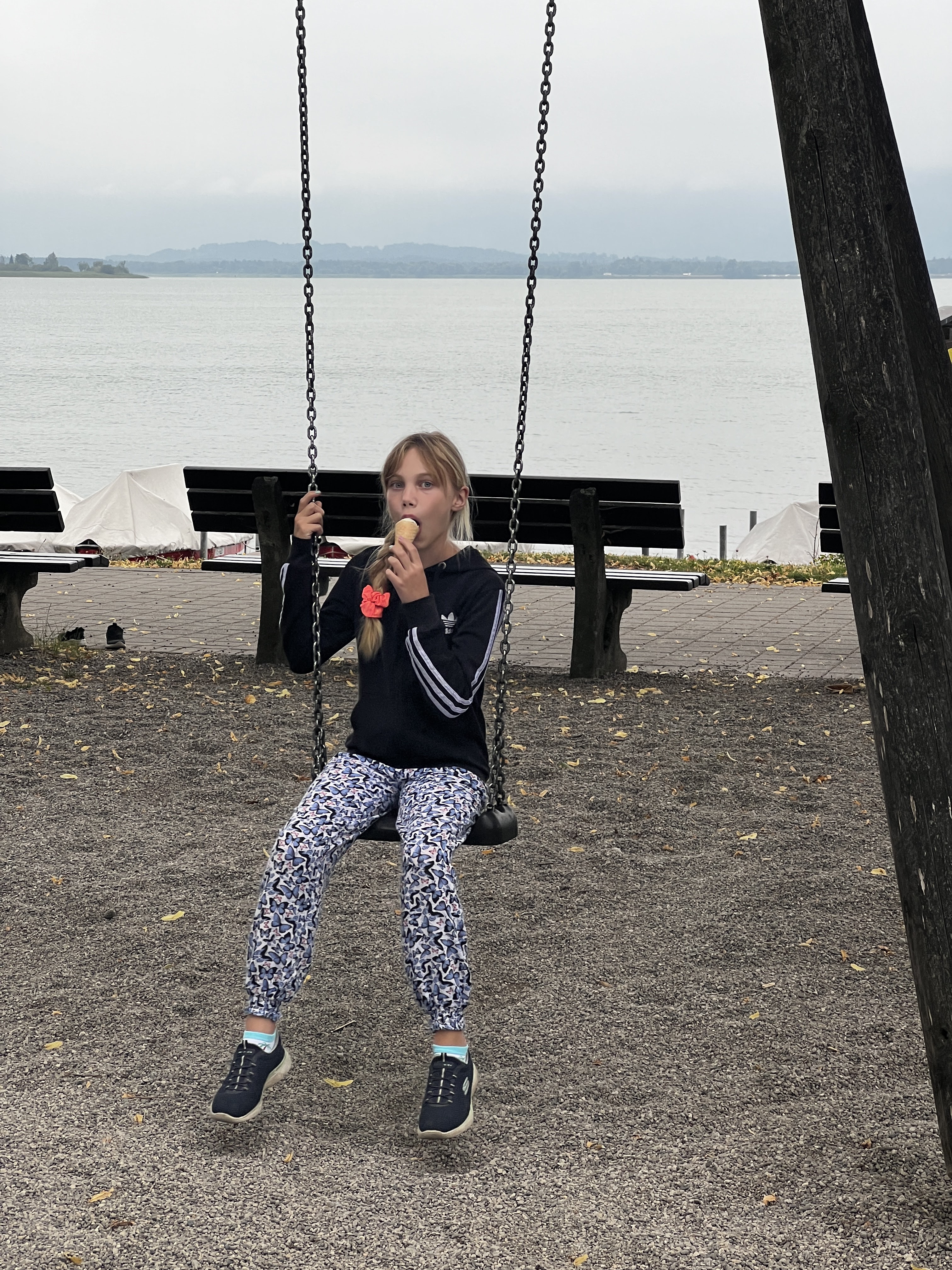 Die Frau begnügt sich mit schnödem Brot. Wer nicht will der hat schon. Weiter geht es. Ab Auf die Autobahn den Rest der Tagestour abreißen. Bei München geht es erst auf die A99 und dann auf die A8. Wir wollen in Prien übernachten. Unserern Platz für die Nacht erreichen wir gegen 16:00 Uhr. Den Platz habe ich wieder über Park4Night gefunden. Beilhackstr. 11 findet man den Platz. Er kostet 15 Euro die Nacht, Strom 0,70 Euro die Kw/h. Nachde wir uns eingerichtet haben, wollen wir an den See. Nach dem langen Sitzen eine Wohltat zu gehen. Am See genießen wir erstmal ein Eis. Kugel 1,80 Euro. Aber lohnt sich.