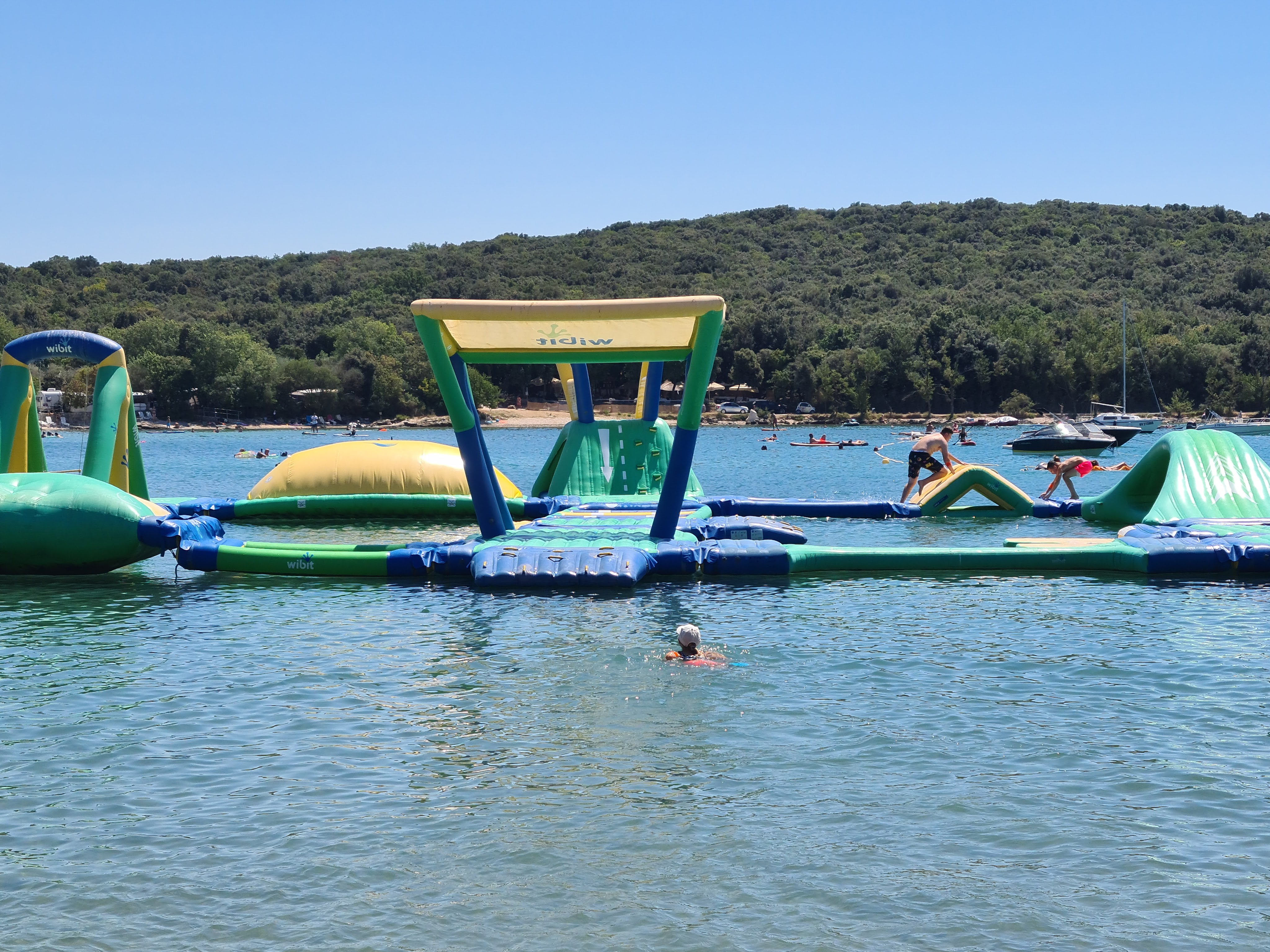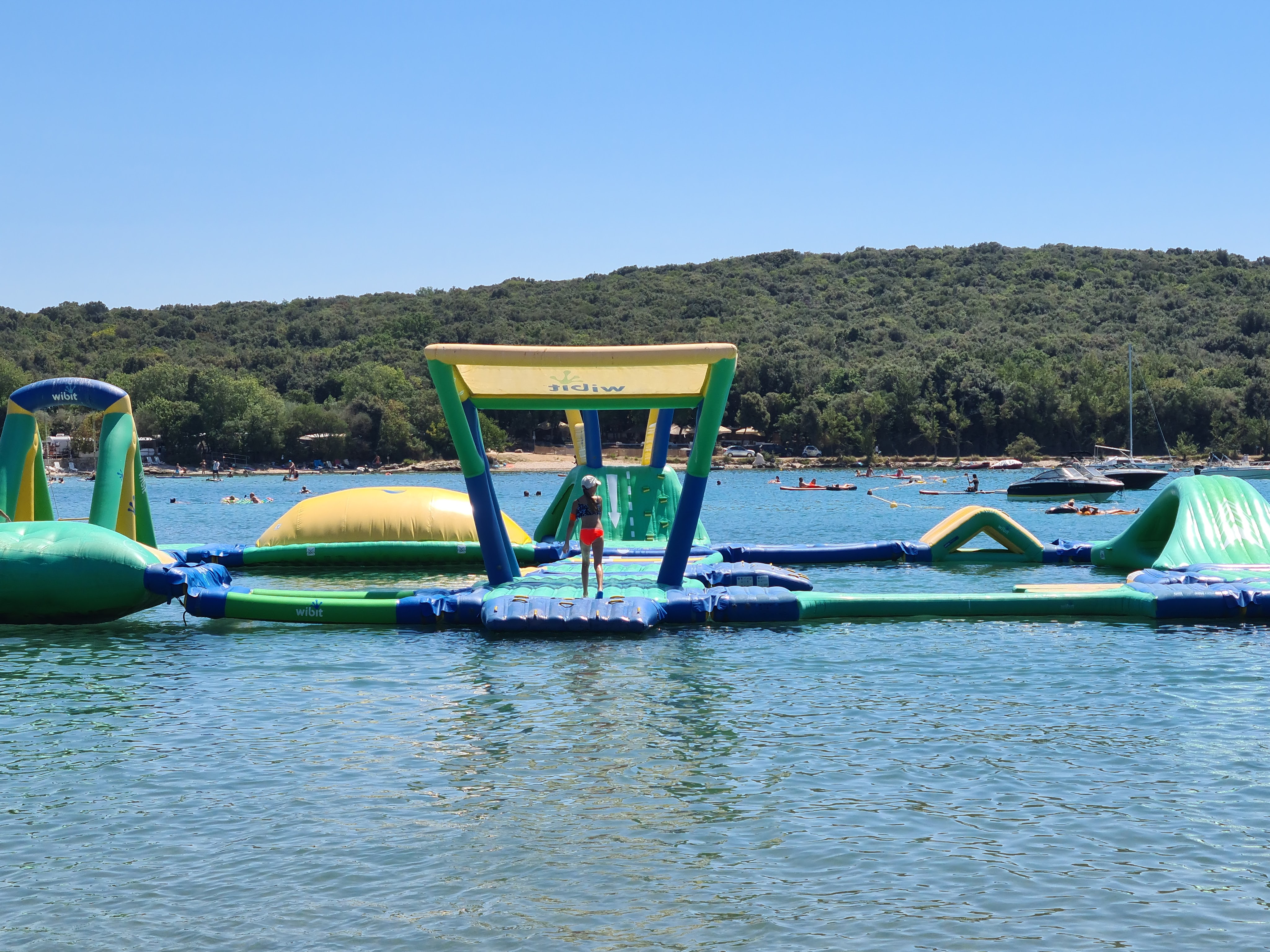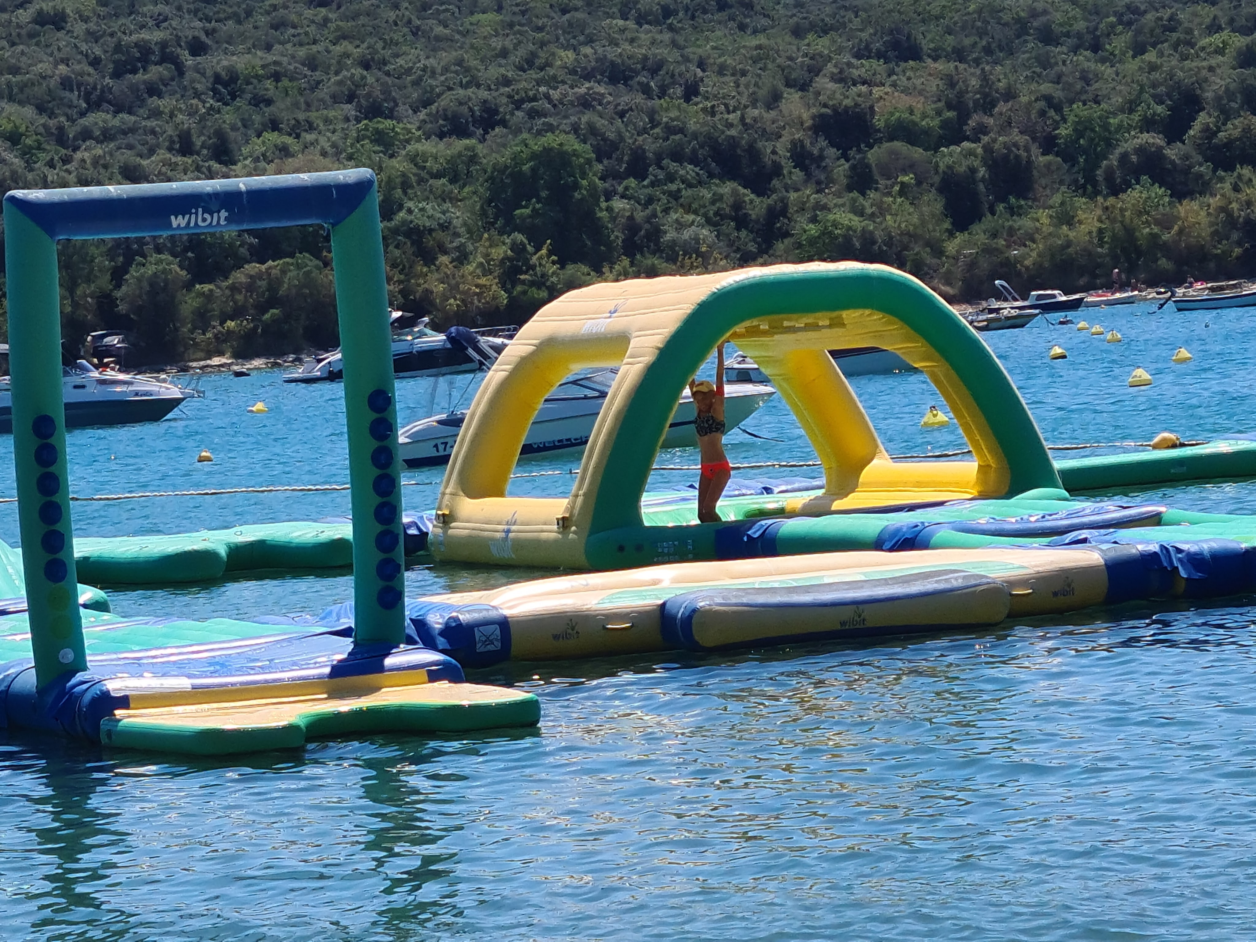 Nun aber erstmal noch ein letztes mal Baden in der Bucht, Marlena möchte auf die Wasserhüpfburg.