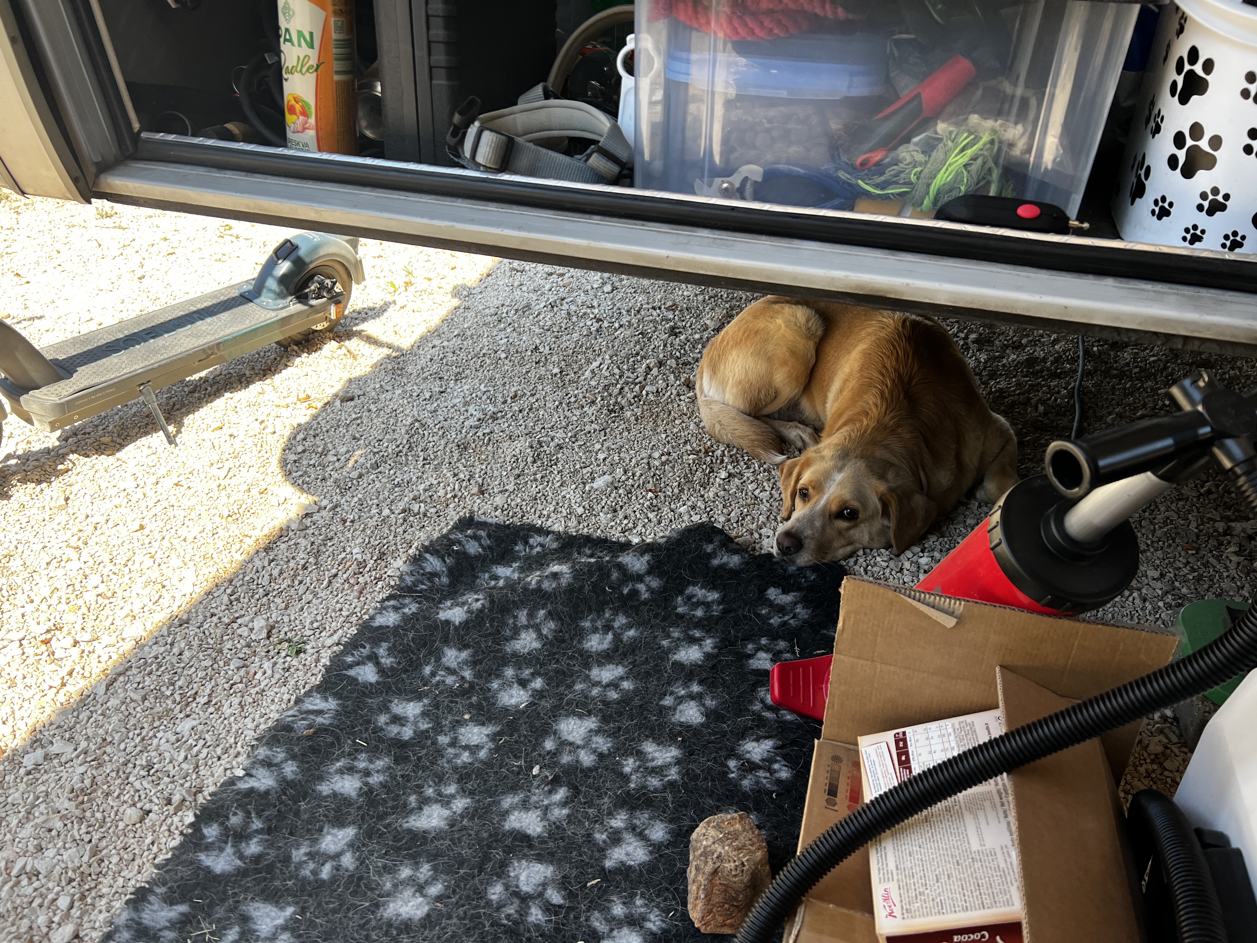Für alles andere, ist es hier einfach zu heiß. Das Themometer zeigt kontinuierlich über 32 Grad, gefühlt 36 Grad an. Da ist es unserem Hund auch zu heiß und seit zwei Tagen versucht sie unter dem Wohnmobil mehr Kühle zu erhalten.