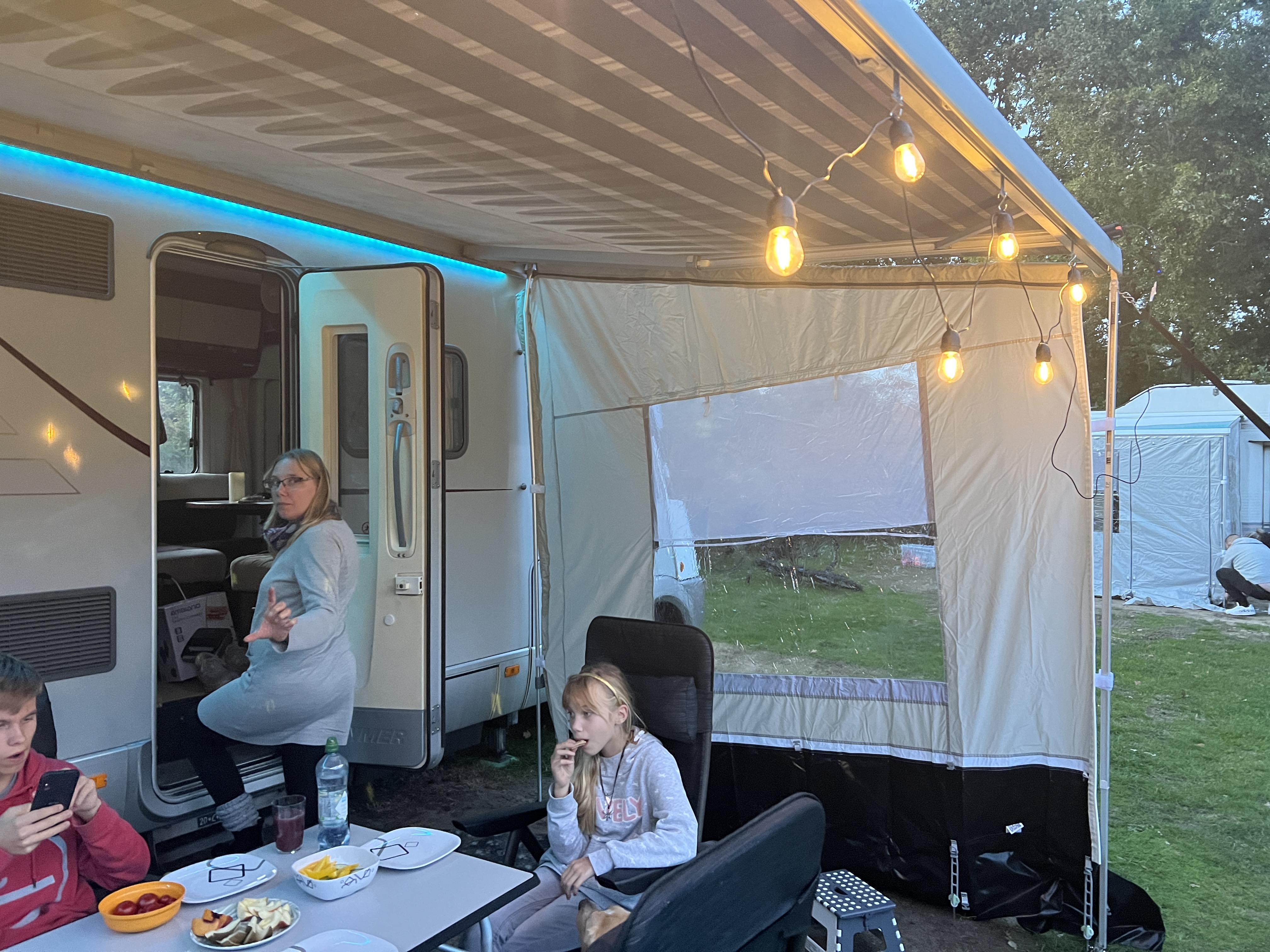 Der Platz scheint gut besucht zu sein, die Warteschlange an der Rezeption bei 2 Anmeldemöglichkeiten war etwas länger. Da bei uns schon alles halbwegs klar war, brauchten wir nur noch unseren Platz und die Karten für das Schwimmbad. Durch eine Kennzeichenerkennung geht die Schranke automatisch auf und dem langen Wochenende stand nichts mehr im Wege. Am Platz haben wir wie immer routiniert alles aufgebaut. Markise raus, das erste Mal das Seitenteil installiert, Tisch und Stühle raus, Lichterkette anhängen, Sturmleine für die Markise anbauen und natürlich die Markise mit dem Wurmi verschrauben. Fertig. In der Zwischenzeit hat die Frau im Wohnmobil alles fertig gemacht.