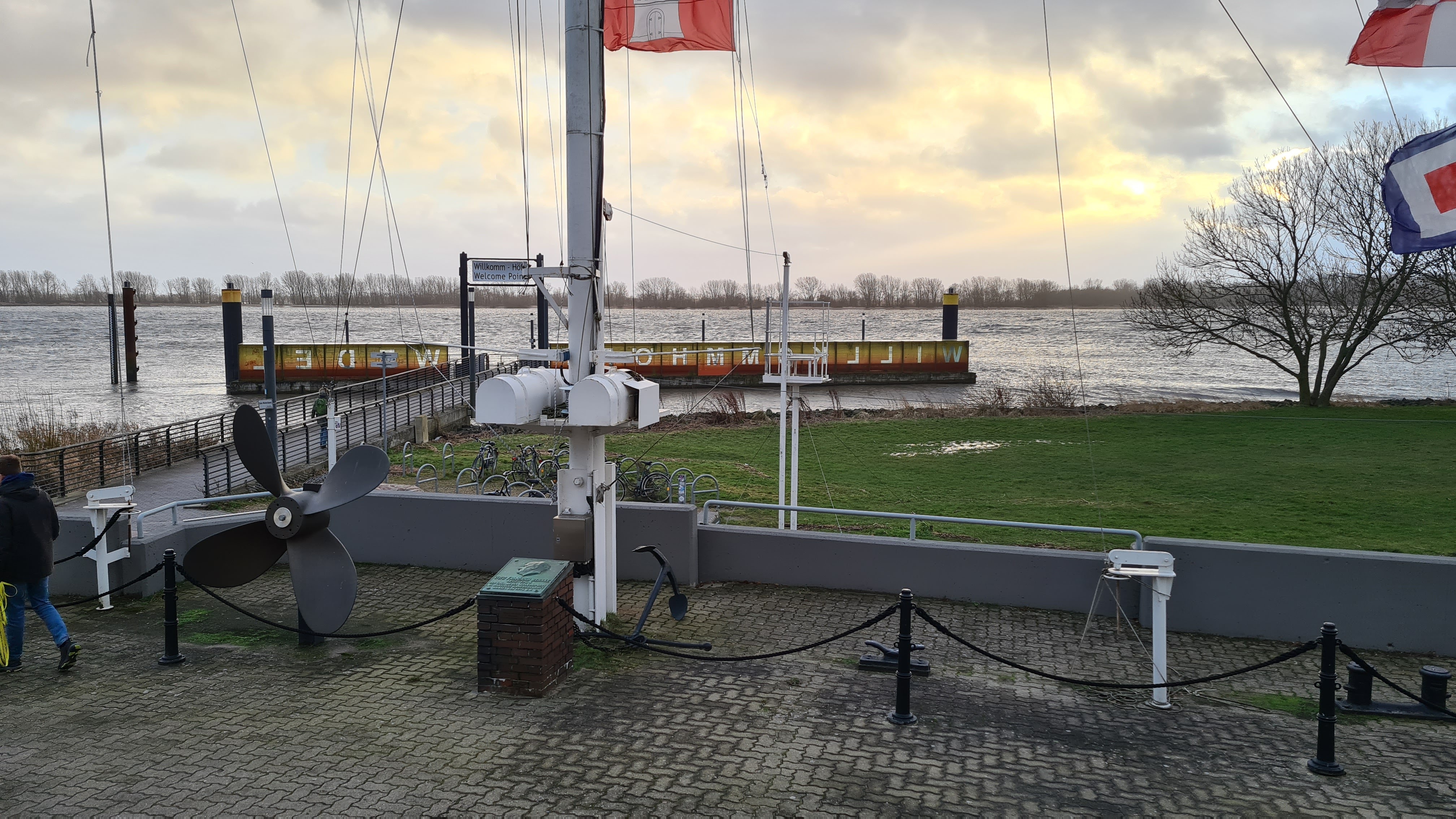 Da wir erst um 15:00 Uhr uns anmelden können, wandern wir zu unserem Ausflugsziel. Wir wollen heute zur Schiffbegrüßungsanlage „Willkomm Höft“ Seid dem 12. Juni 1952 werden dort die Schiffe, die auf der Elbe in den Hamburger Hafen einfahren, traditionell mit ihrer Nationalhymne begrüßt. Weltweit ist die Schiffsbegrüßungsanlage Willkomm Höft bekannt – und das seit nun 70 Jahren. Insgesamt 153 Hymnen wurden einst eingespielt und der Begrüßungstext in der jeweiligen Landessprache aufgenommen. Bis 1978 wurden dieses auf Schallplatten abgespielt. Eine Seite Nationalhymne, andere Seite Begrüßungstext. Von 1978 bis 1997 wurden dann Tonbandcassetten genommen bevor die Daten alle auf Festplatte gesichert wurden und per Touchscreen abgespielt werden. Die Gäste des Restaurants erhalten nebenbei von den sogenannten Begrüßungskapitänen auch noch weitere Informationen wir Ziel der Reise, Länge des Schiffes und vieles mehr. In dem dort vorhandenen Cafe kann man sehr gut die Zeit fließen lassen um es sich gut gehen zu lassen.