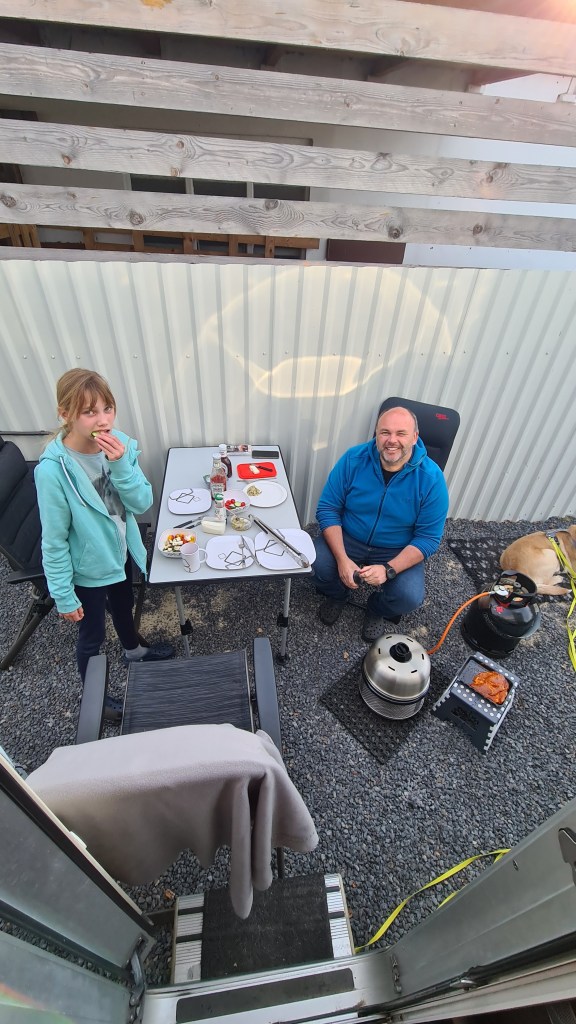 Ich bekomme den Auftrag ein Eiscafe zu suchen. Schnell gefunden marschieren wir in die Richtung. Das Eiscafe San Remo ist gut besucht, trotzdem dauert es nach der Bestellung keine 5 Minuten bis unser Eis vor uns stand. Zu moderaten Preisen. Danach also wieder zurück Mobil. Während der Vater einen anderen Weg nimmt und die Möglichkeiten der Mobilität nutzt. E-Scooter sei Dank, gehen Frau und Tochter weiter. Ich springe schnell unter die Dusche im Mobil. Die anderen beiden stellen fest, dass Marlena ihre Tasche vergessen hat im Eiscafe. Also springt der Vater mal wieder in die Klamotten und auf das E-Scooter Mobil und holt die Tasche ab. Zu Abschluss des Tages wird gegrillt und die Flasche Wein geöffnet.