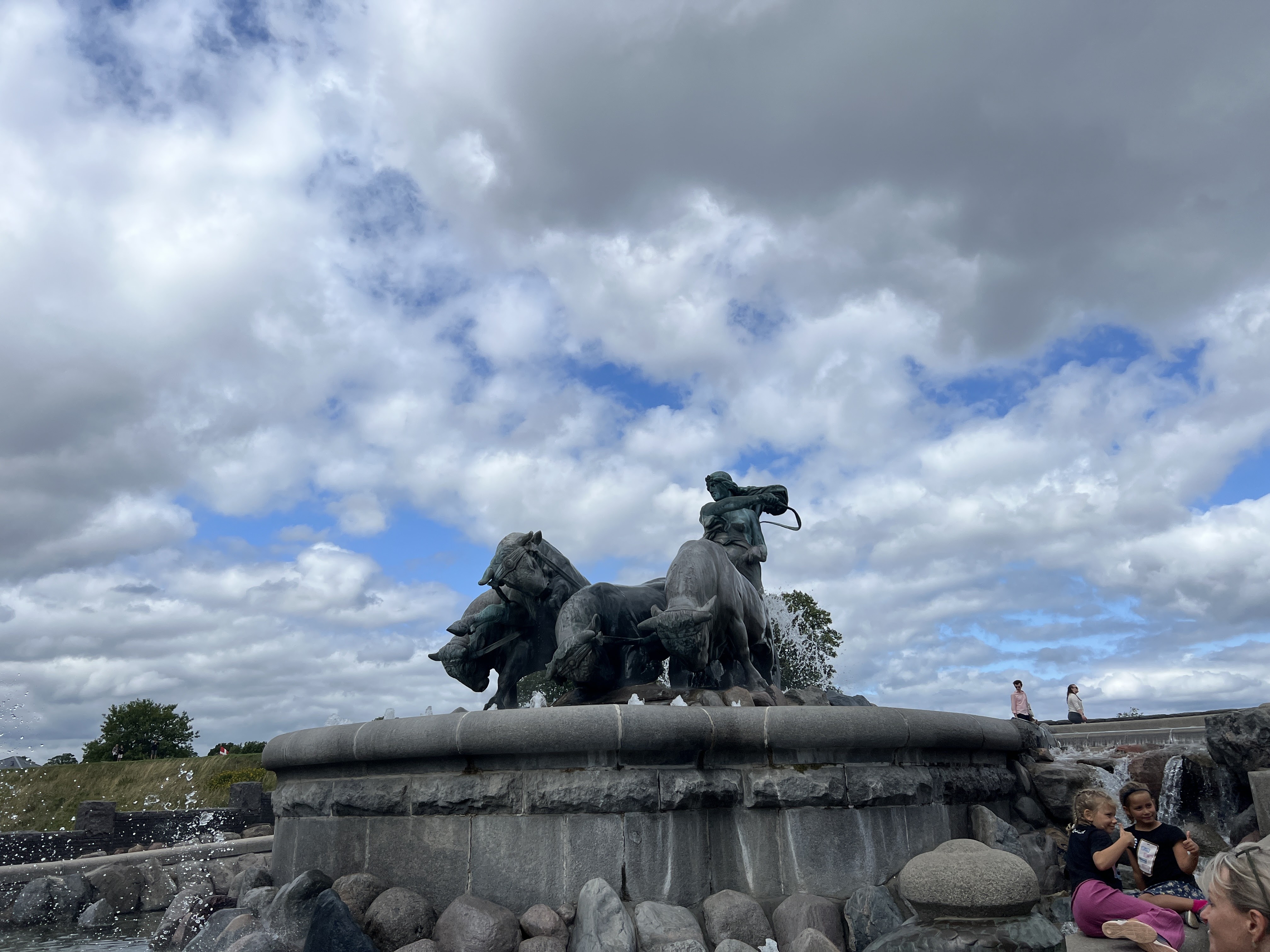 Auf dem Rückweg treffen wir noch auf dem Gefion-Brunnen. Er ist das größte Denkmal in Kopenhagen und wird als Wunschbrunnen benutzt. Die Figurengruppe zeigt Gefion, die Asenjungfrau aus der germanischen Mythologie und ihre zu Stieren verwandelten Söhne, welche mit einem Pflug eine Furche zwischen der Insel Seeland und Schweden herauspflügen und damit Seeland vom Festland zu trennen.