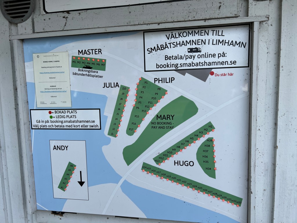 Nachdem wir wieder mal elegant durch die Mautstelle gefahren sind, steuern wir den bereits vor zwei Jahren angefahrenen Ställplats Småbåtshamnen i Limhamn an. Direkt am Hafen gelegen in Sichtweite der Brücke ist dieser Platz ein beliebter Platz zur Besichtigung der Stadt. Das Bild am EIngang verdeutlich das nur zu gut.