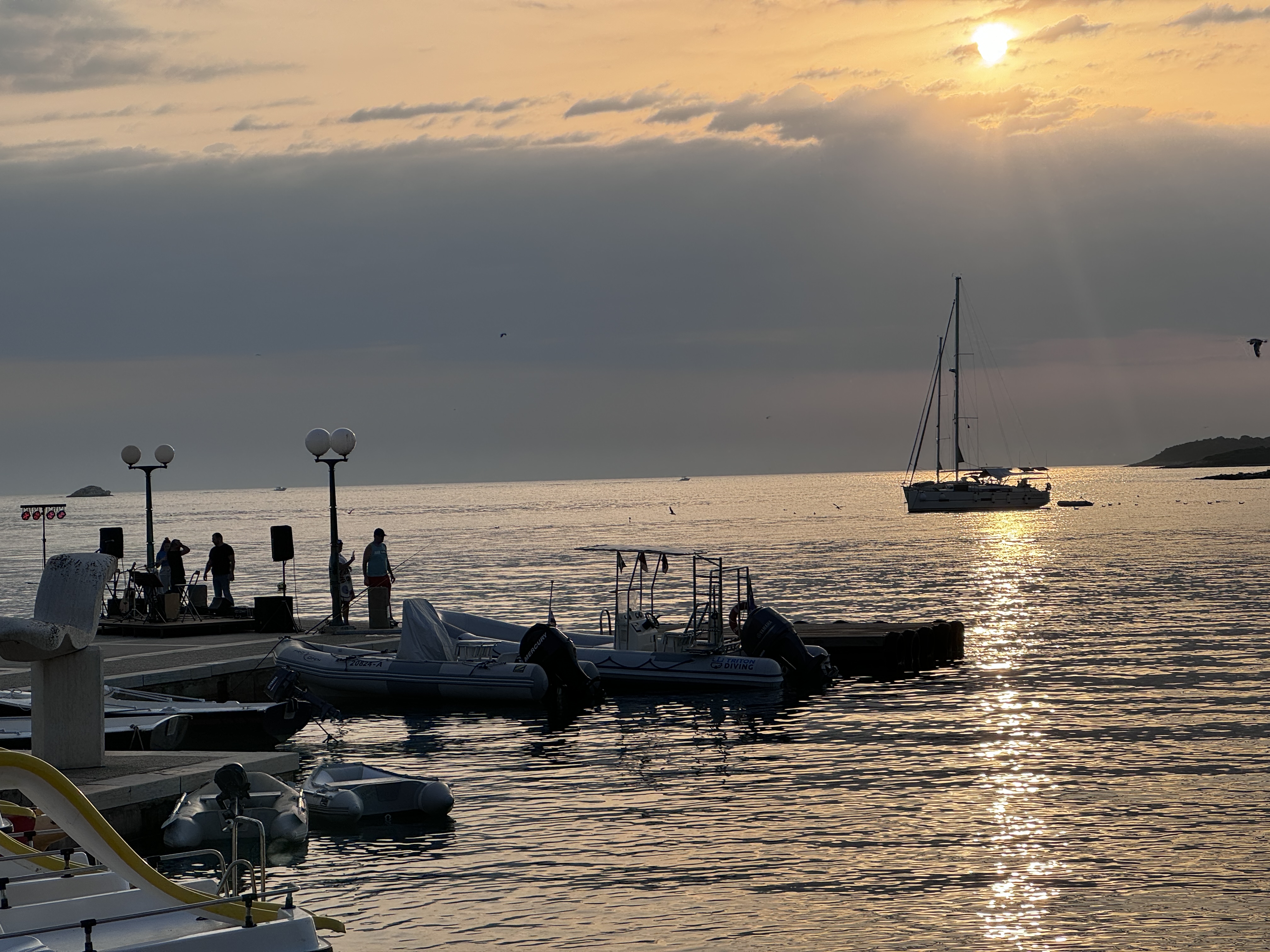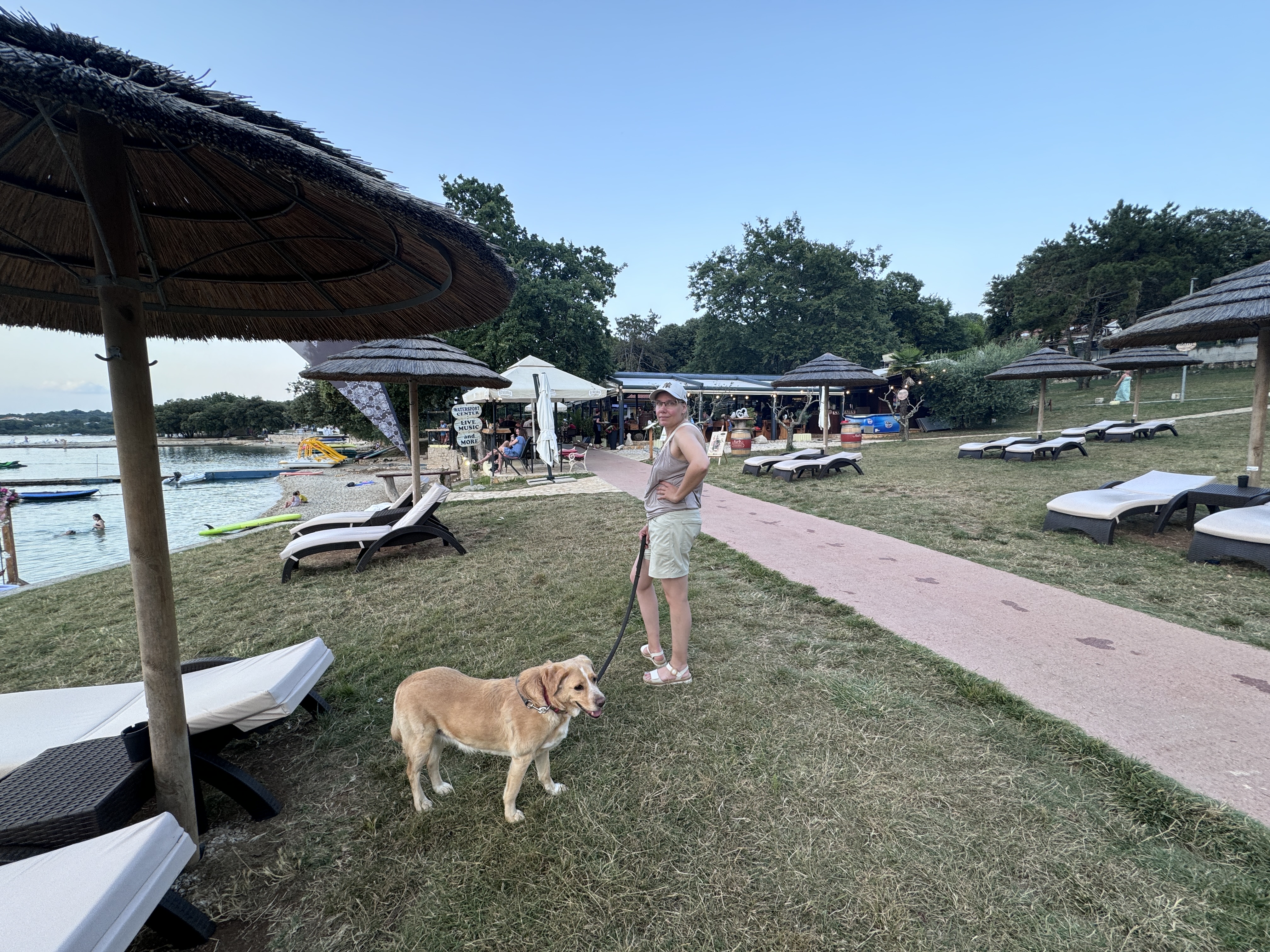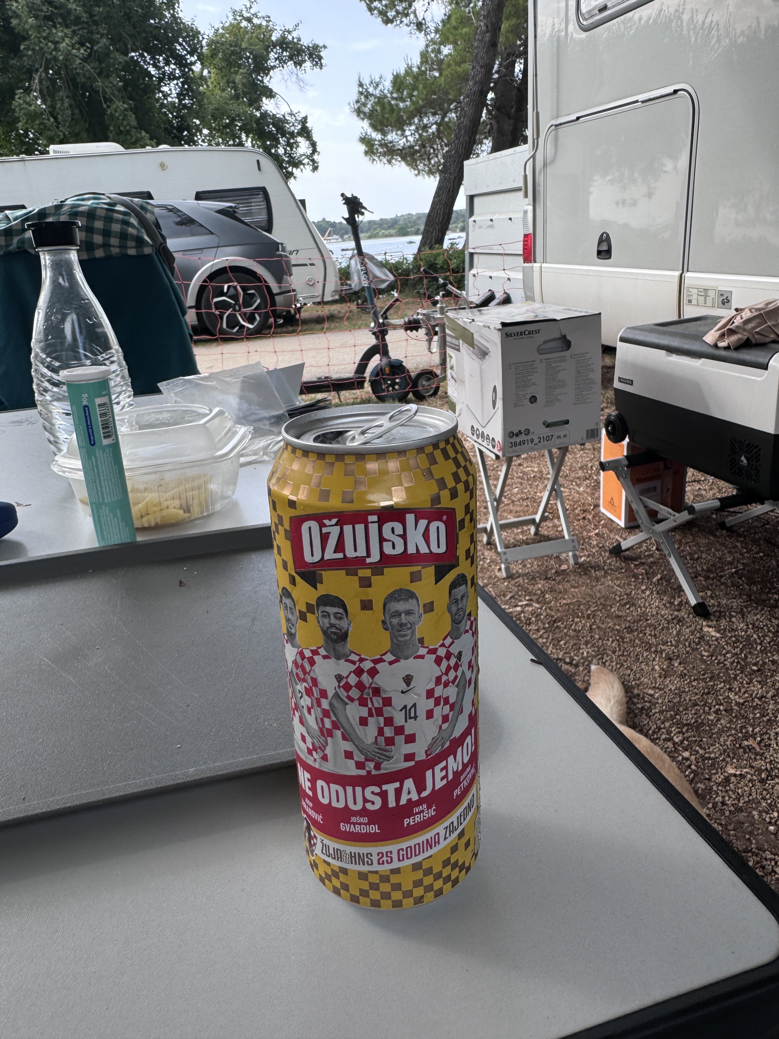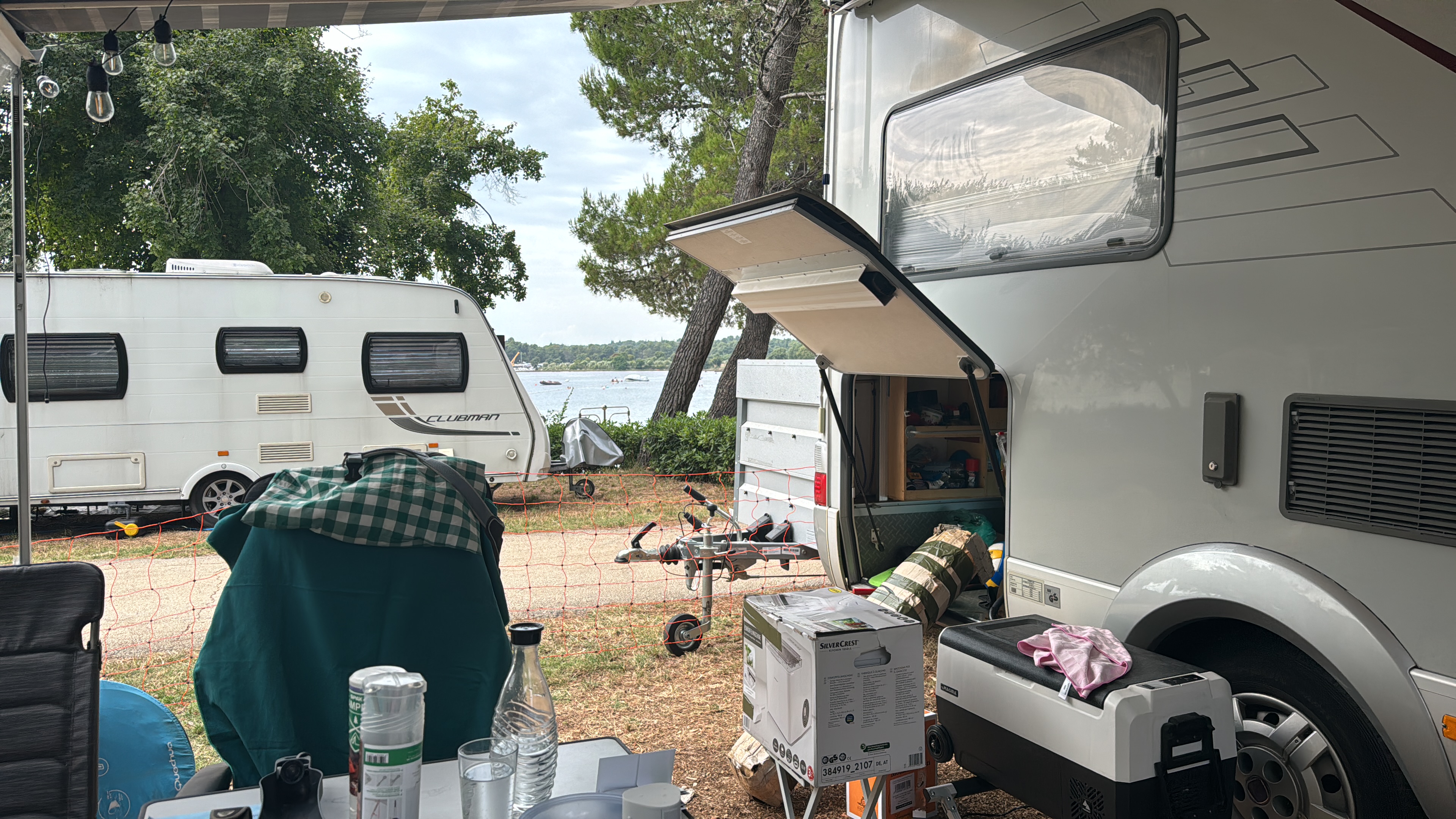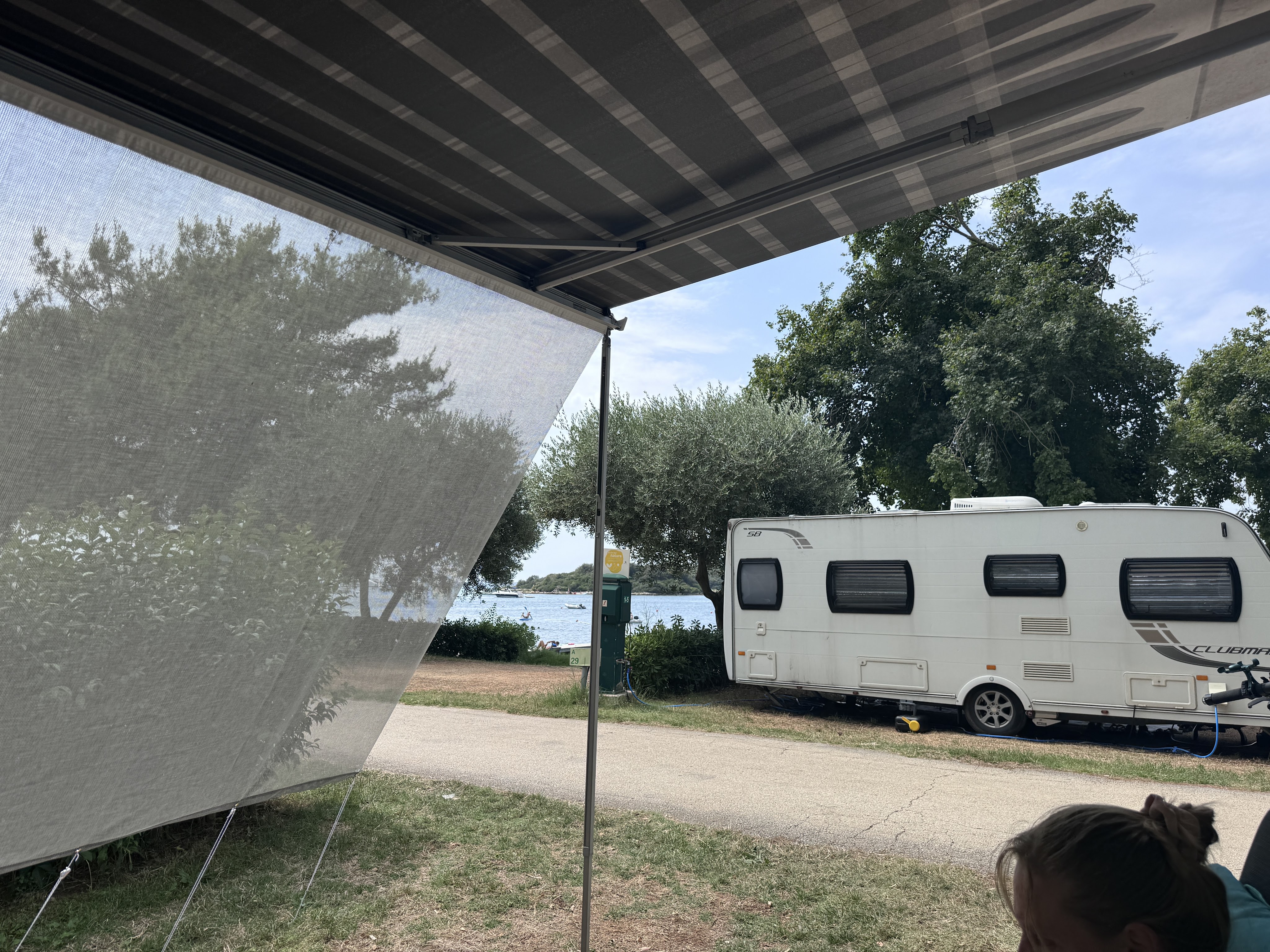 Am Sonntag sollten dann die letzten Kilometer bis zum Campingplatz hinter uns gebracht werden. Wir wollten uns stärken an der angeschlossenen Schlachterei. Dort gab es nur ein Problem. Die haben am Sonntag auch zu. Also ohne belegte Brötchen losfahren. Die Autobahn schnell erreicht, Mautstelle hinter uns gelassen und schon waren wir in Slowenien. Ein wunderschönes Land und wir nehmen uns wieder vor, irgendwann hier Urlaub zu machen. Die Grenze nach Kroatien ist auch schnell erreicht und um 12:52 Uhr stehen wir auf dem Wartestreifen zum Campingplatz. Durch den Online Check-In gestern war auch das nur ein 5 minutiger Aufenthalt in der Rezeption und um 13:20 Uhr stehen wir auf unserer Parzelle. Zweite Reihe zum Meer. Aber vor der Erholung steht die Arbeit. Parzelle aufbauen. Markise raus, Anhänger hinter das Mobil stellen. Sonnenschutz aufbauen. Zelt aufbauen, man muss ja schauen ob es passt. Stühle raus, Tisch aufbauen und dann ist Urlaub.