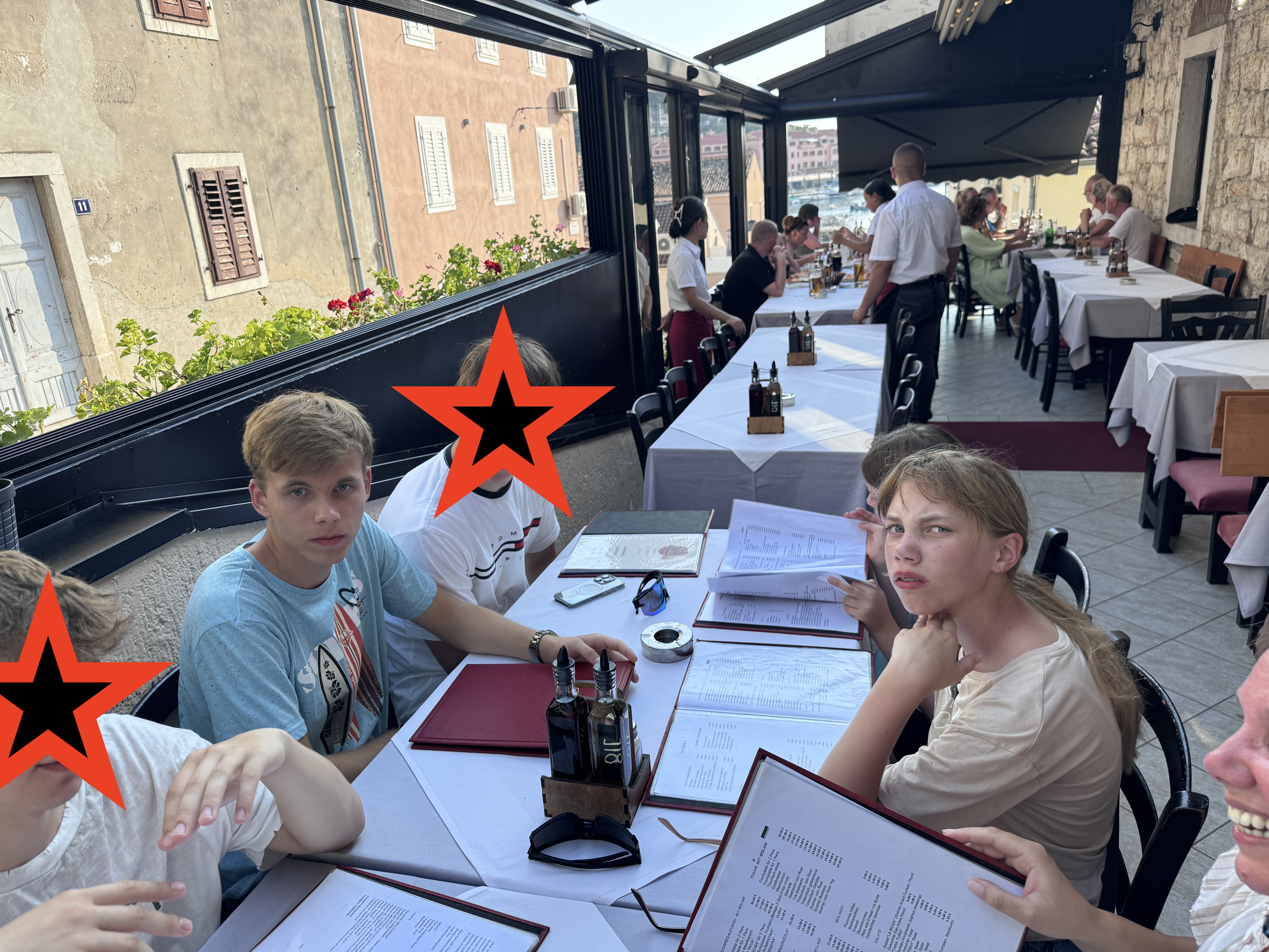 Am Nachmittag begeben wir uns auf den Weg in das Örtchen Vrsar. Die märchenhafte Kleinstadt Vrsar liegt direkt am Limski Kanal in der Region Istrien zwischen den Städten Porec und Rovinj. Wir wollen dort was Essen mit allen und die Jungs hatten gesterns schon ein Restaurant gefunden, was sie als annehmbar empfunden hat. WIr haben Glück das für 7 Personen noch was frei ist. Als wir zu ende gegessen haben war eine Warteschlange vor dem Lokal. Es gab einmal Spaghetti Bolognese, einmal Spagehttie Carbonara und dreimal die Grillplatte für 2 Personen.