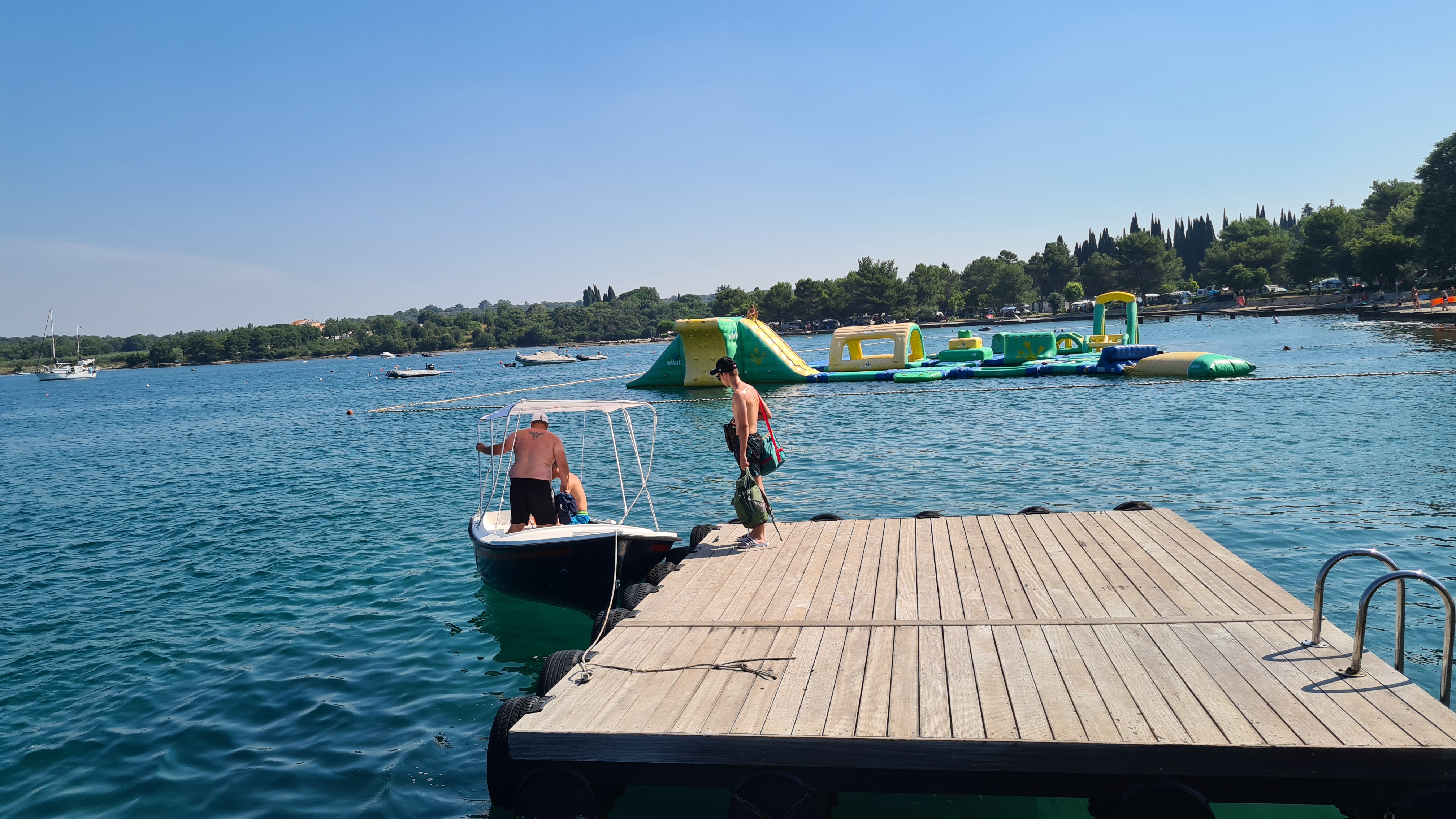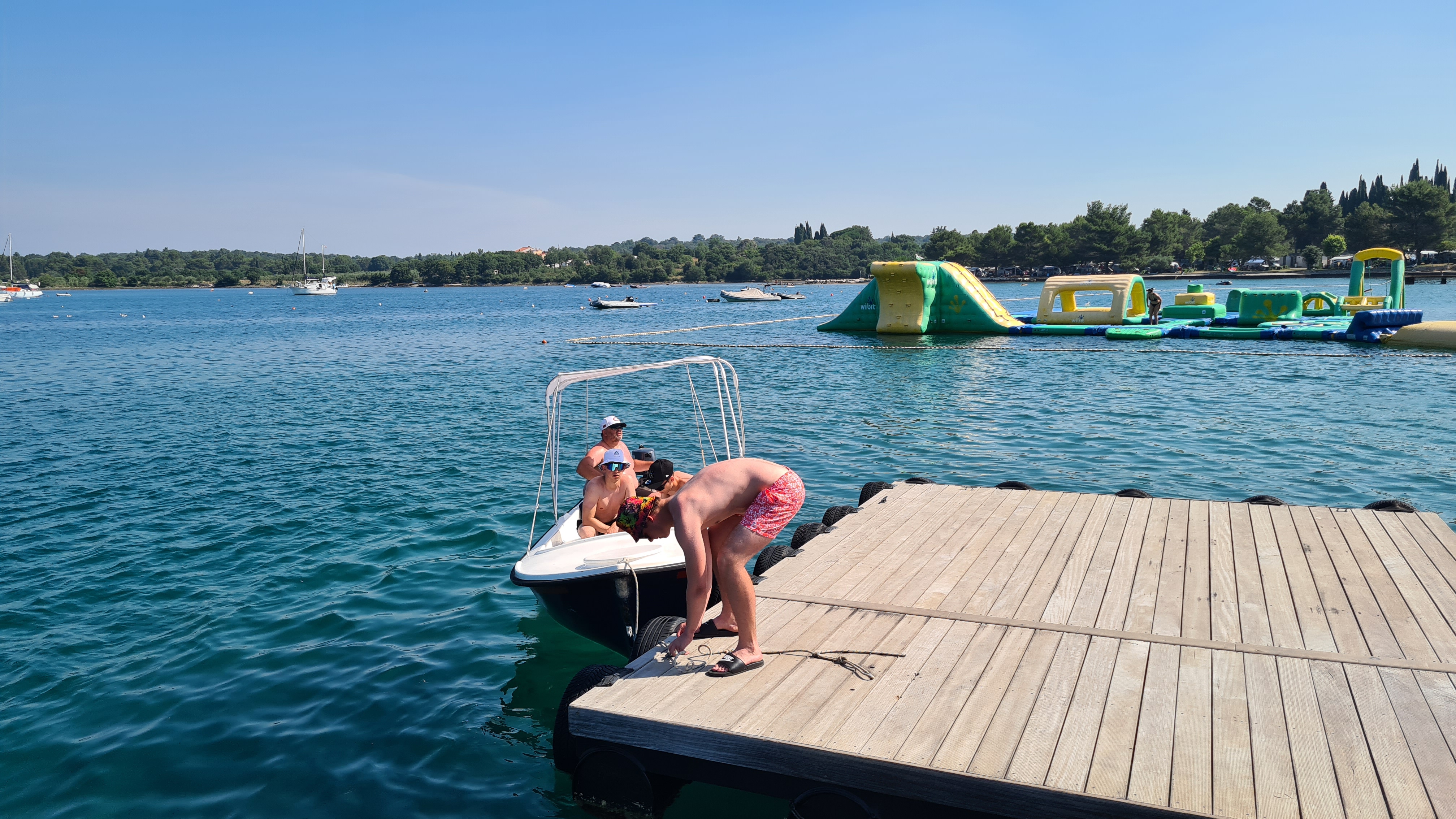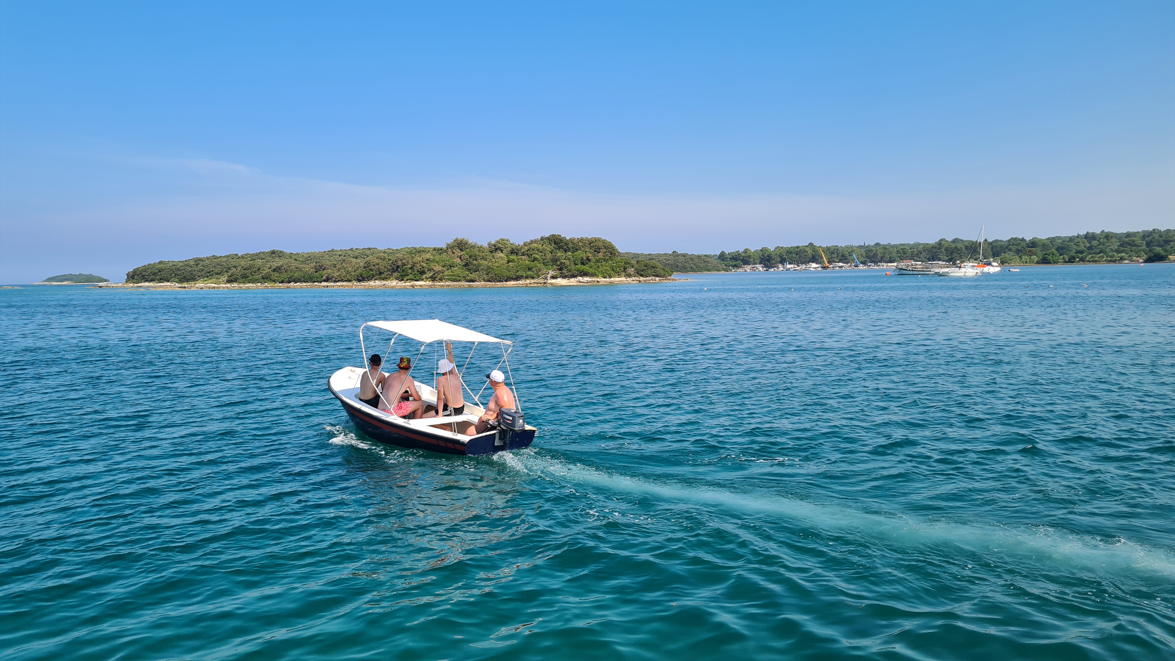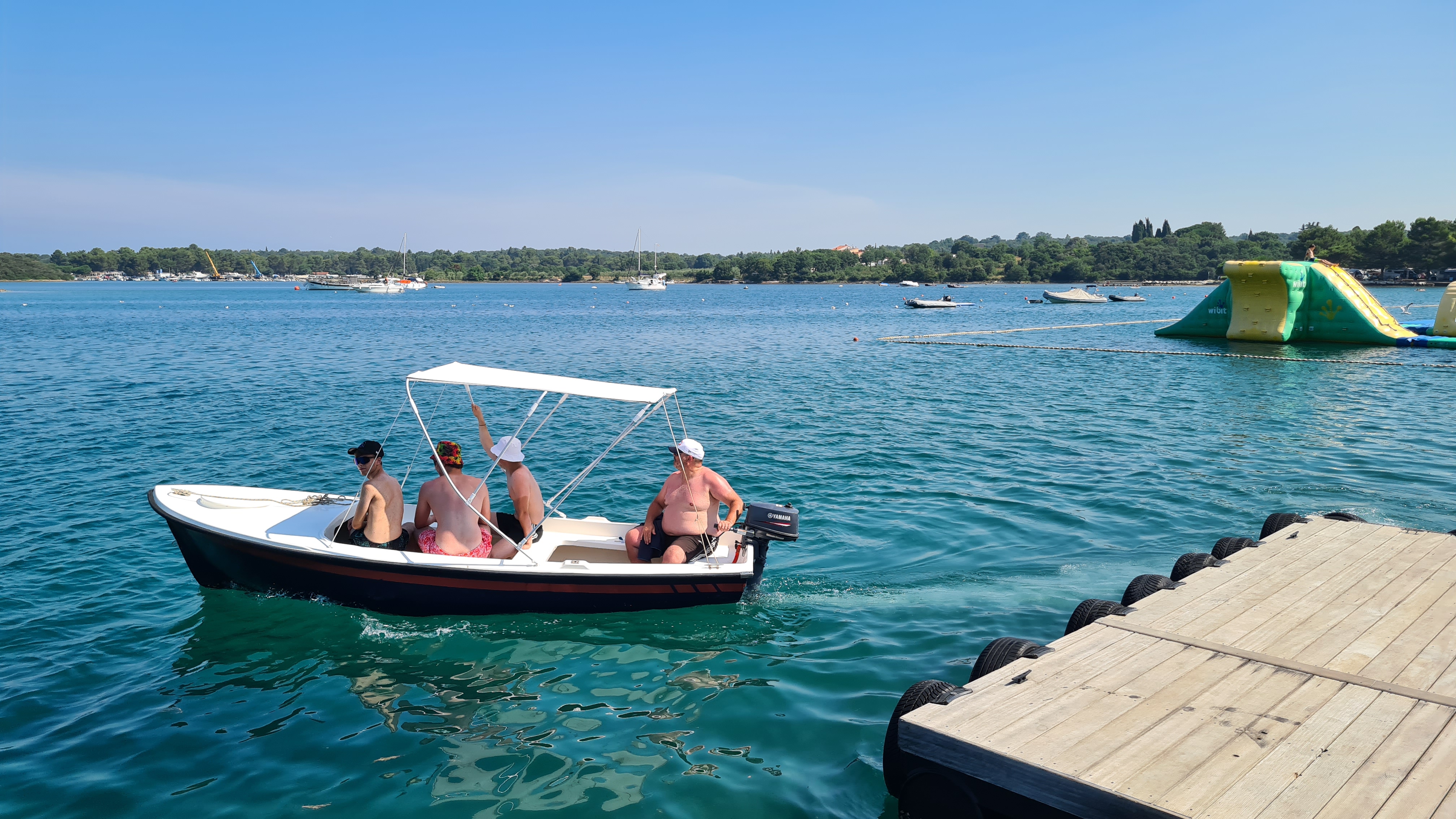 Um kurz vor 10:00 Uhr sind wir am Anleger und das Boot ist schon da. Es liegt am Ponton und wartet auf uns. Es hat einen kleinen Außenbordmotor der Marke Yamaha und hat glaube ich nicht mal 10 PS. Als erste fahre ich mit den Jungs auf das Meer hinaus. Mal schauen wir weit wir kommen.
