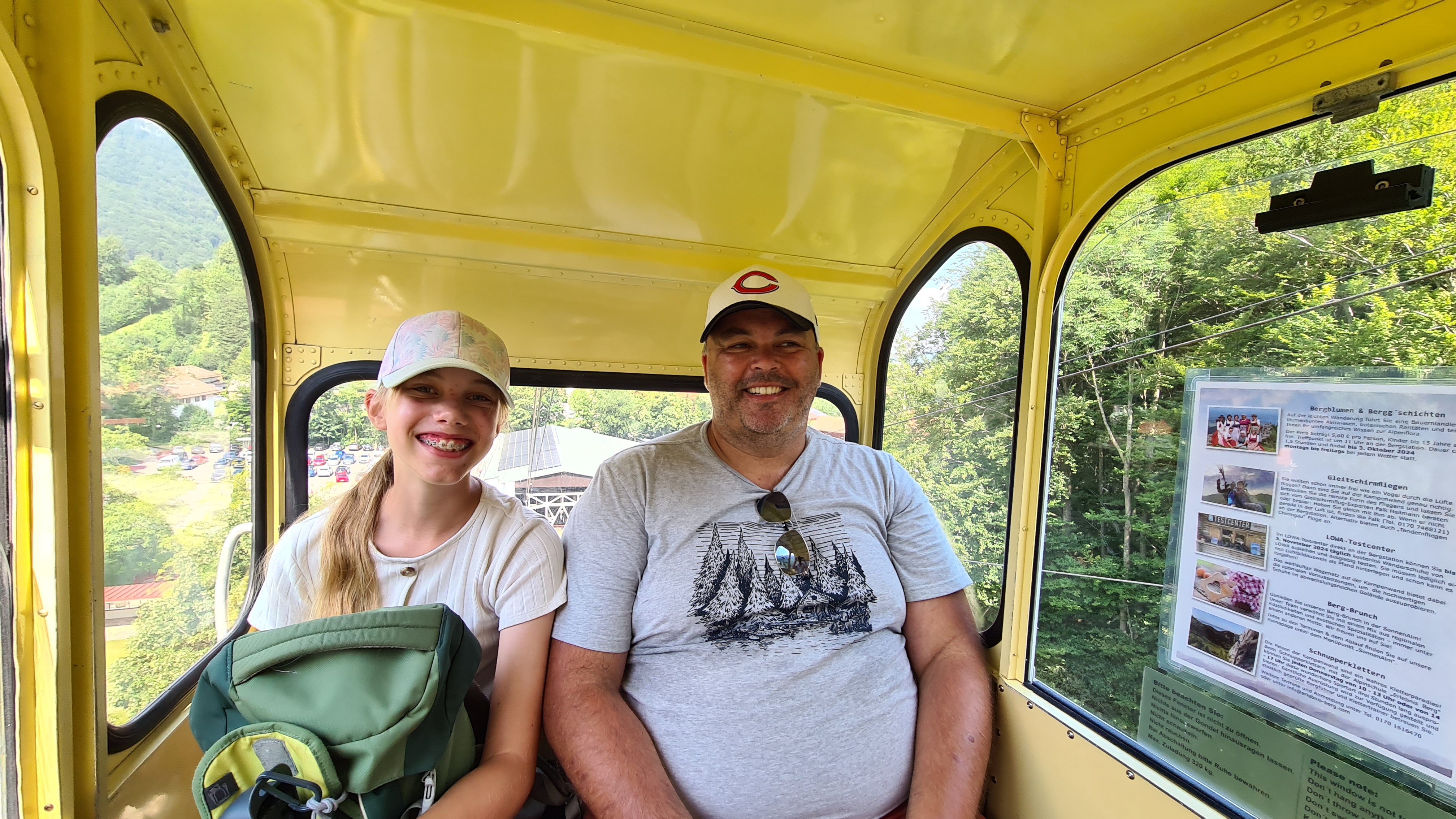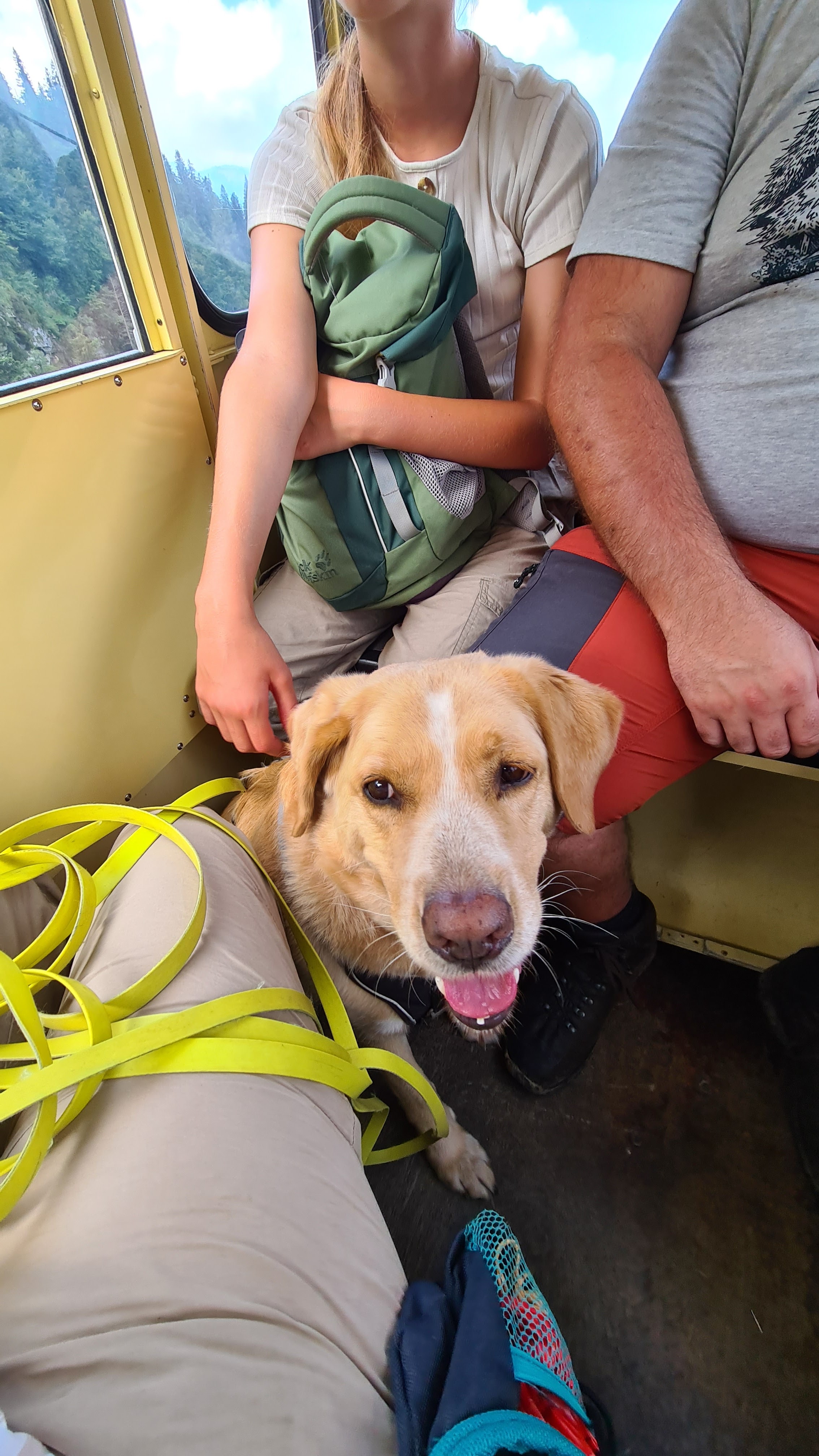 Wir bezahlen unsere Bergfahrt und steigen in die kleine Kabine. Unser Hund ist das alles nicht geheuer aber sie findet sich damit ab.