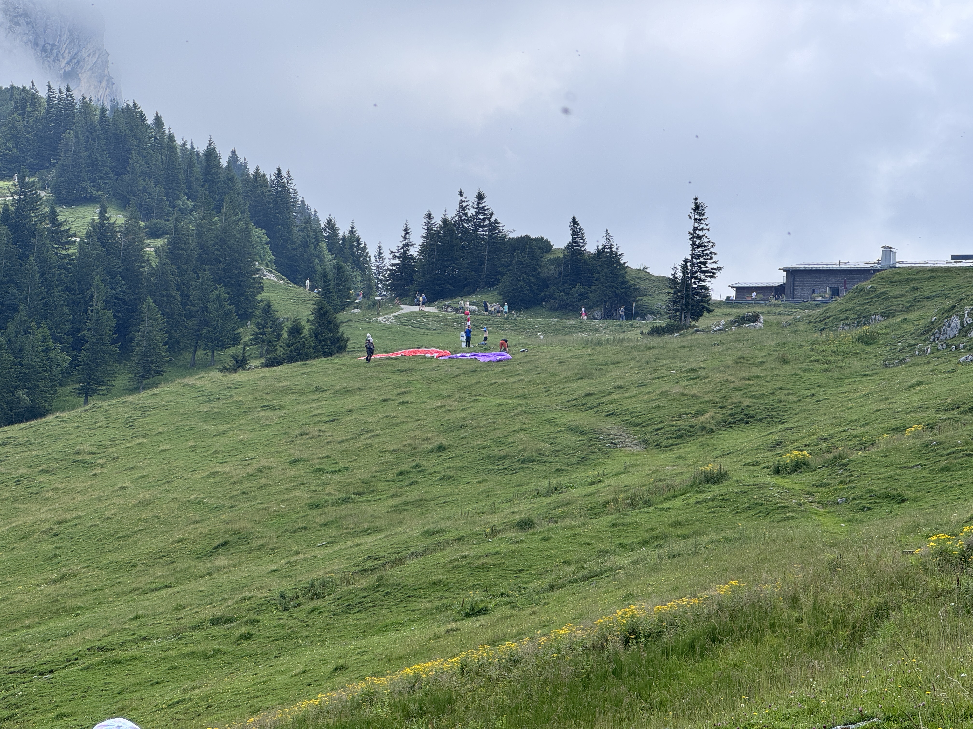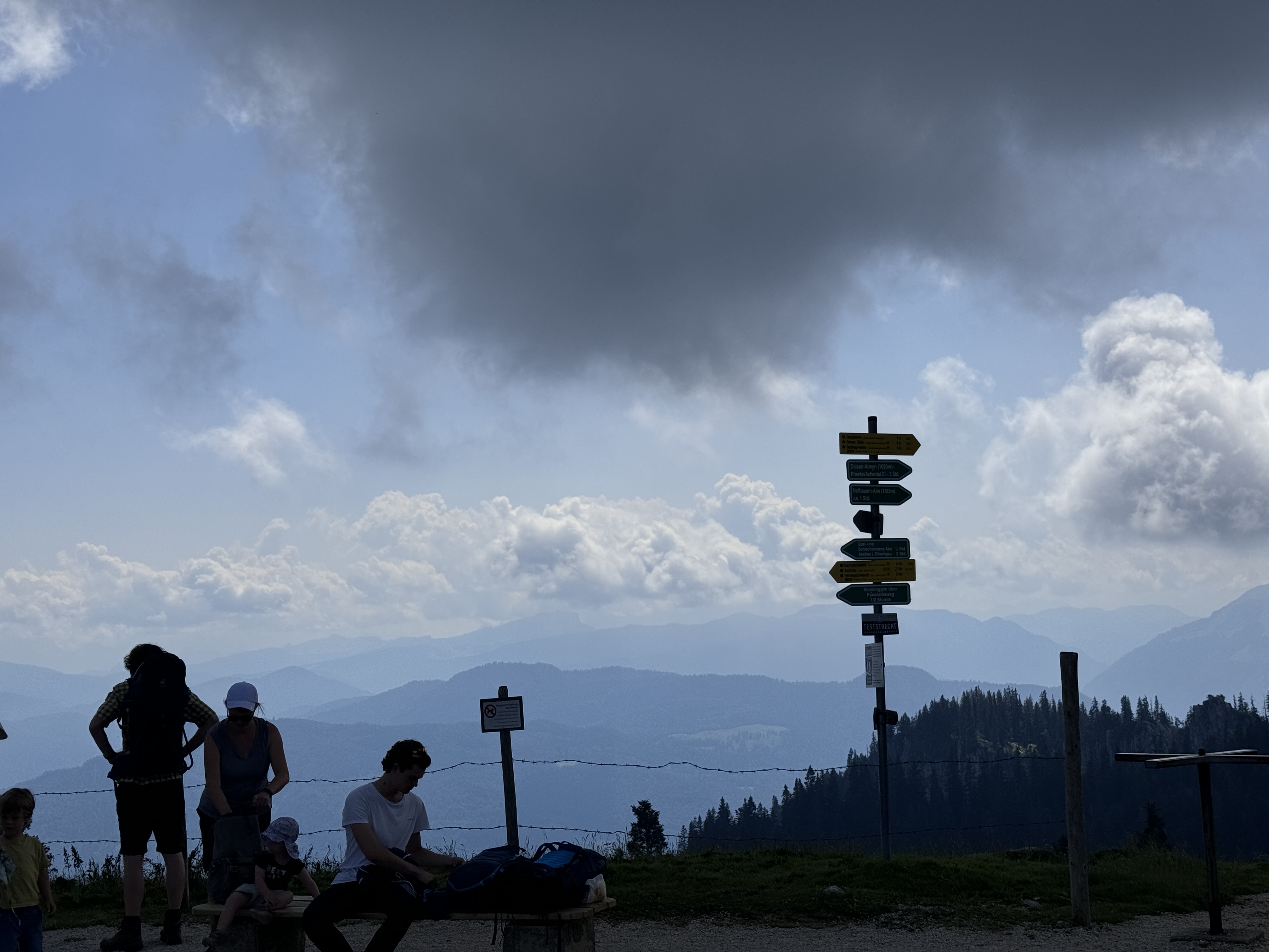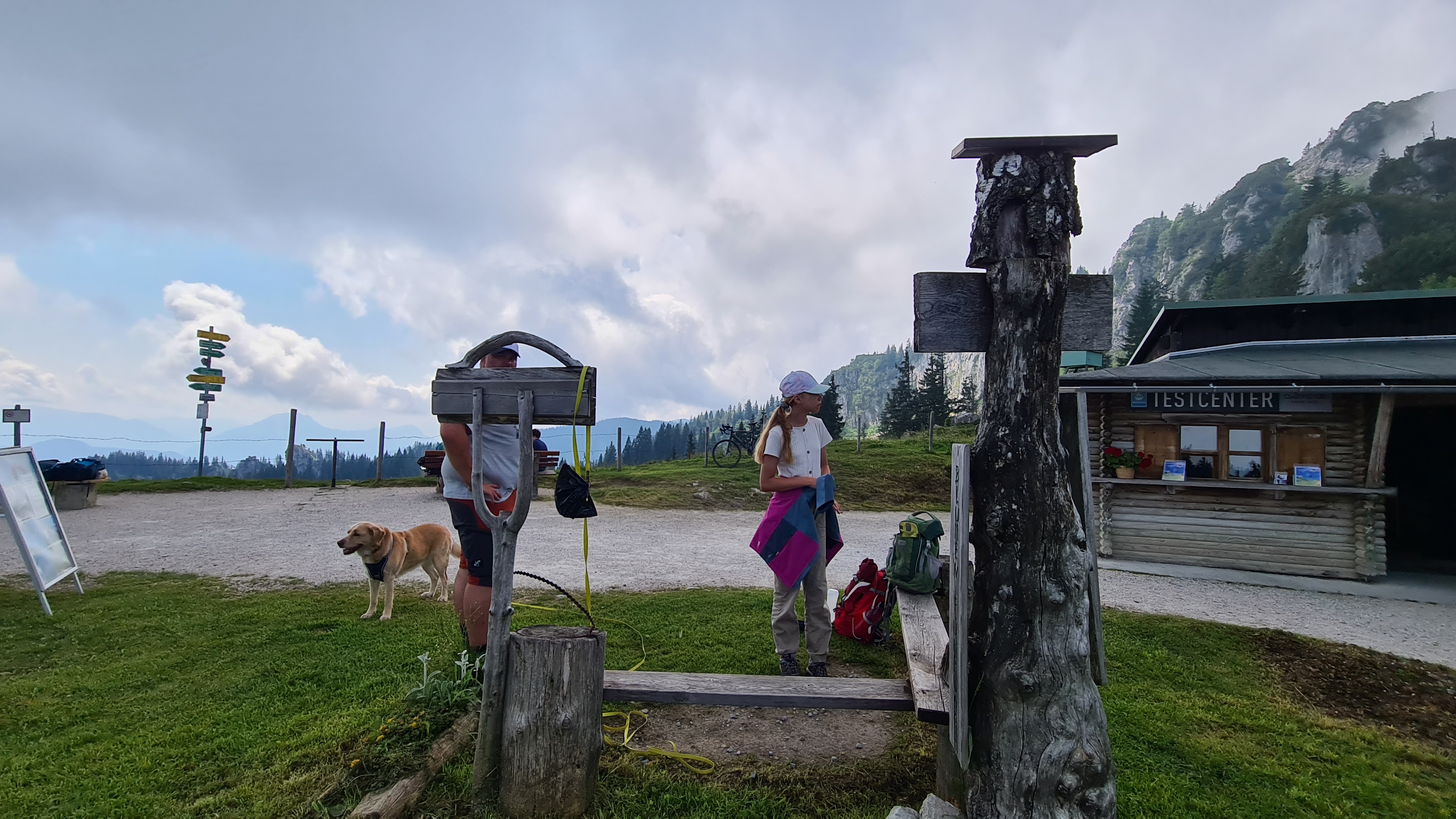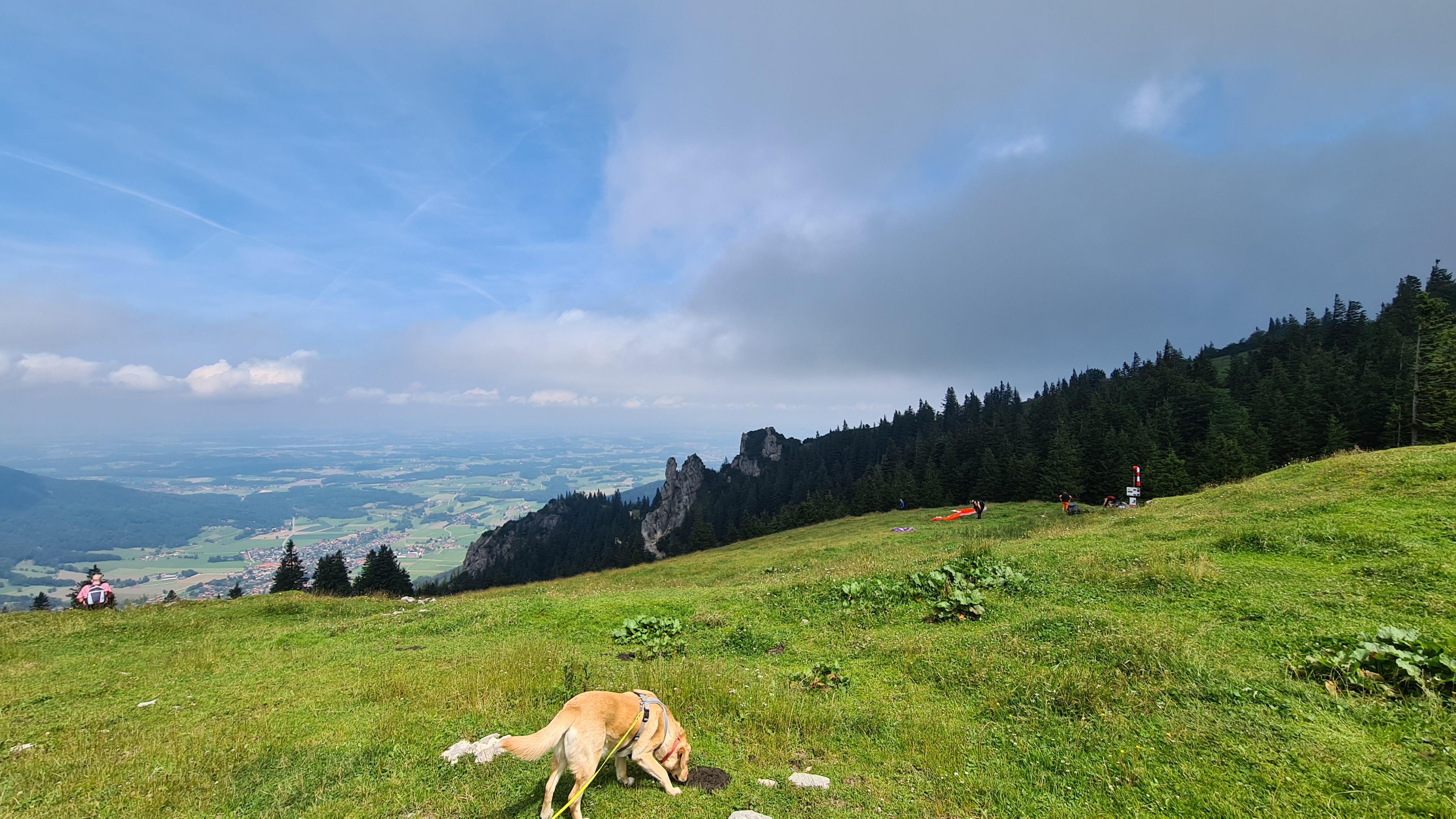 Oben, bei 1467 Metern Höhe angekommen empfängt uns zum einen eine etwas kühlere Luft und zum anderem ein grandioser Ausblick. Nach dem besuchen des Wellnessbereiches wandern wir drei mit der Begeleitung des Hundes dem Berg hinab. An grünen Wiesen vorbei. Es starten Paragleitflieger am Berg, Fahradfahrer fahren dem Berg hinauf. Mal mit Trittunterstützung mal ohne. Je mehr wir uns von der Bergstation entfernen, umso ruhiger wird es. Der Weg ist am Anfang asphaltiert, was zum Laufen nicht so prickelnd ist, biegt aber bald in den Wald ab. Der kleine Abschnitt täuscht allerdings, als wir wieder aus dem Wald heraus kommen erreichen wir die beiden Almen. Für eine Einkehr zu früh. Aber wir nehmen einen kleinen Snack zu uns. So wird der Rucksack schon mal leichter.