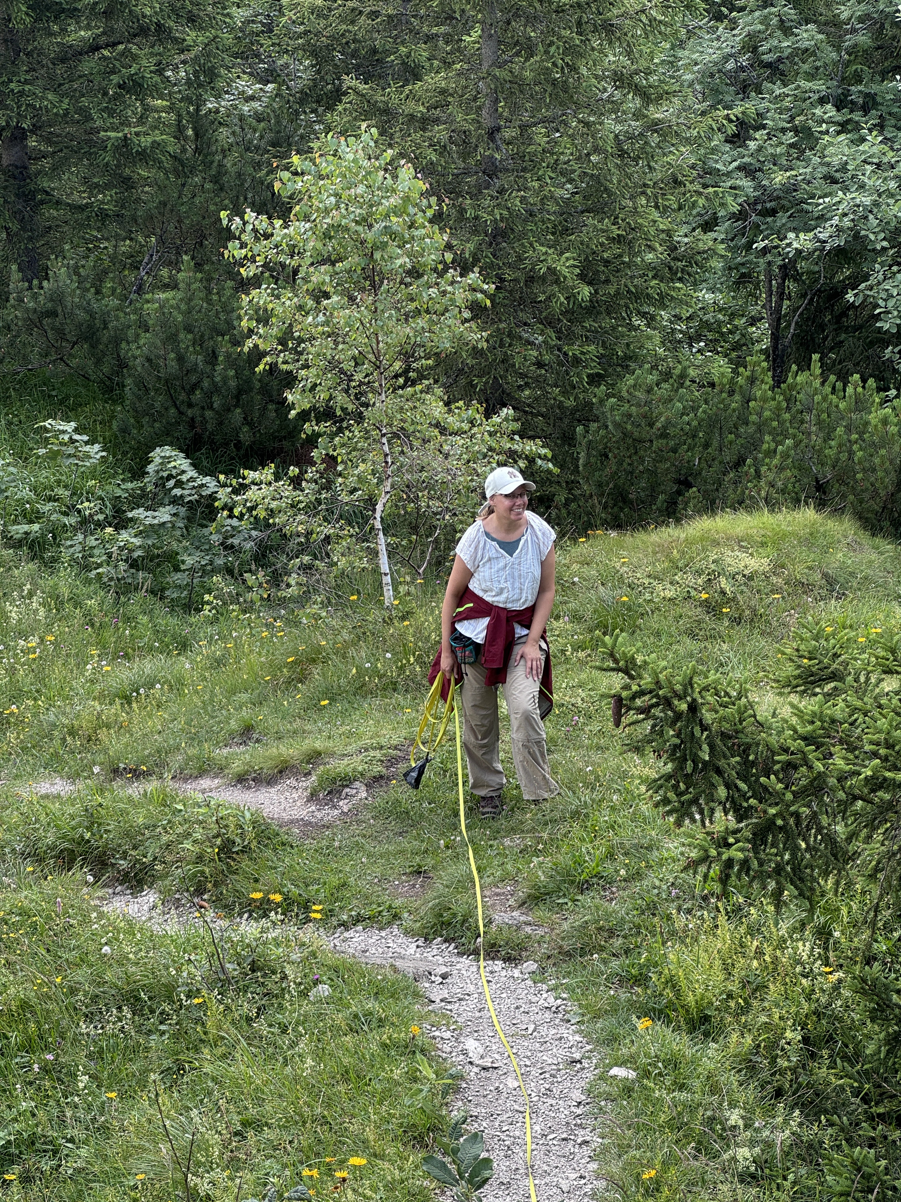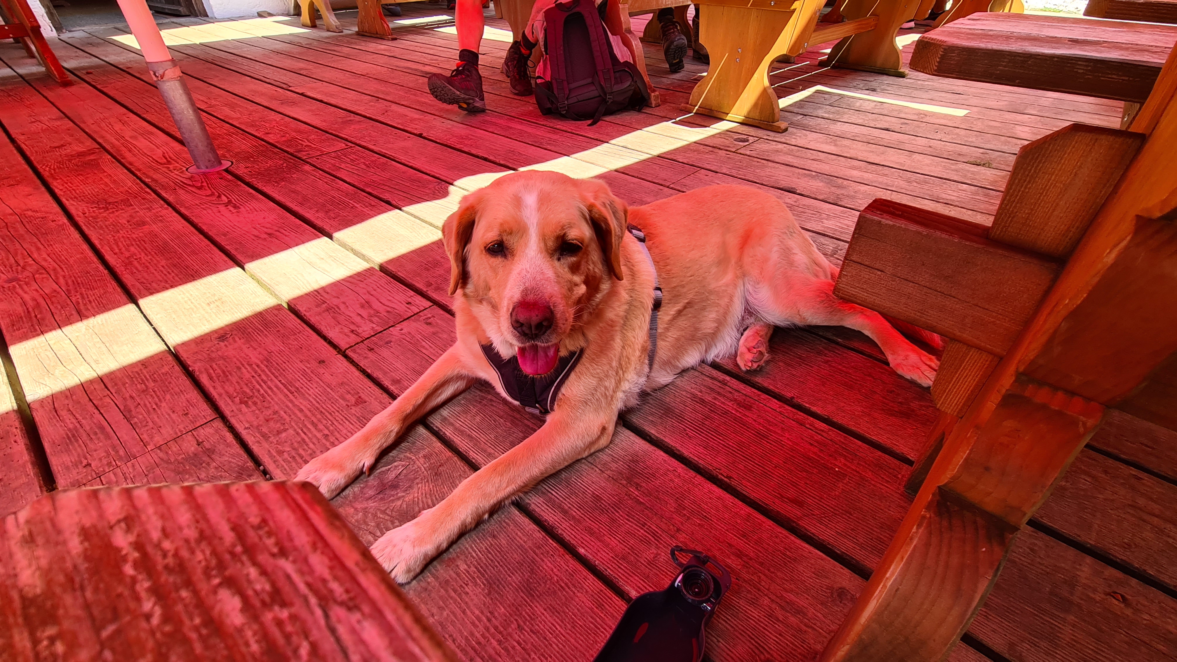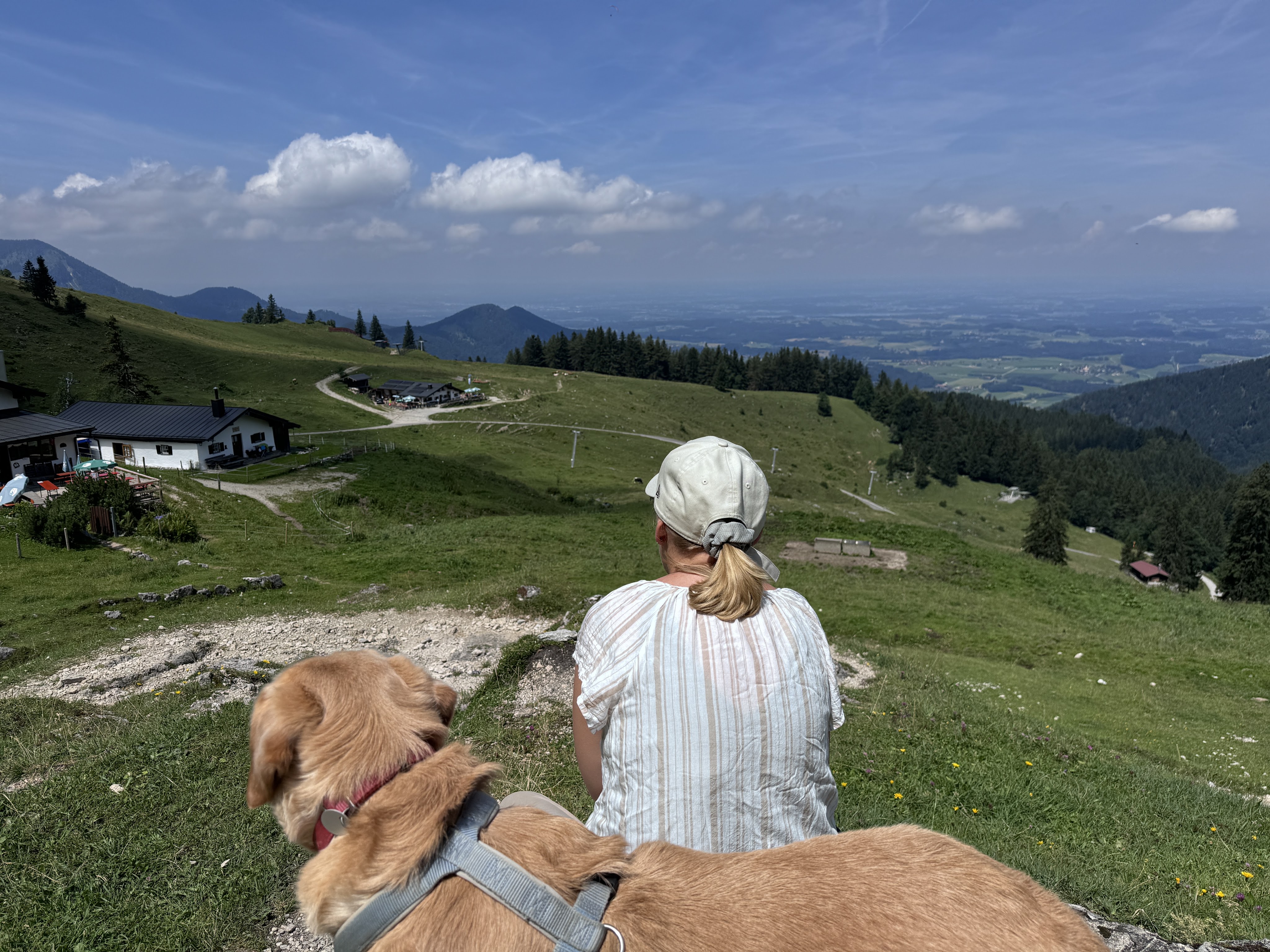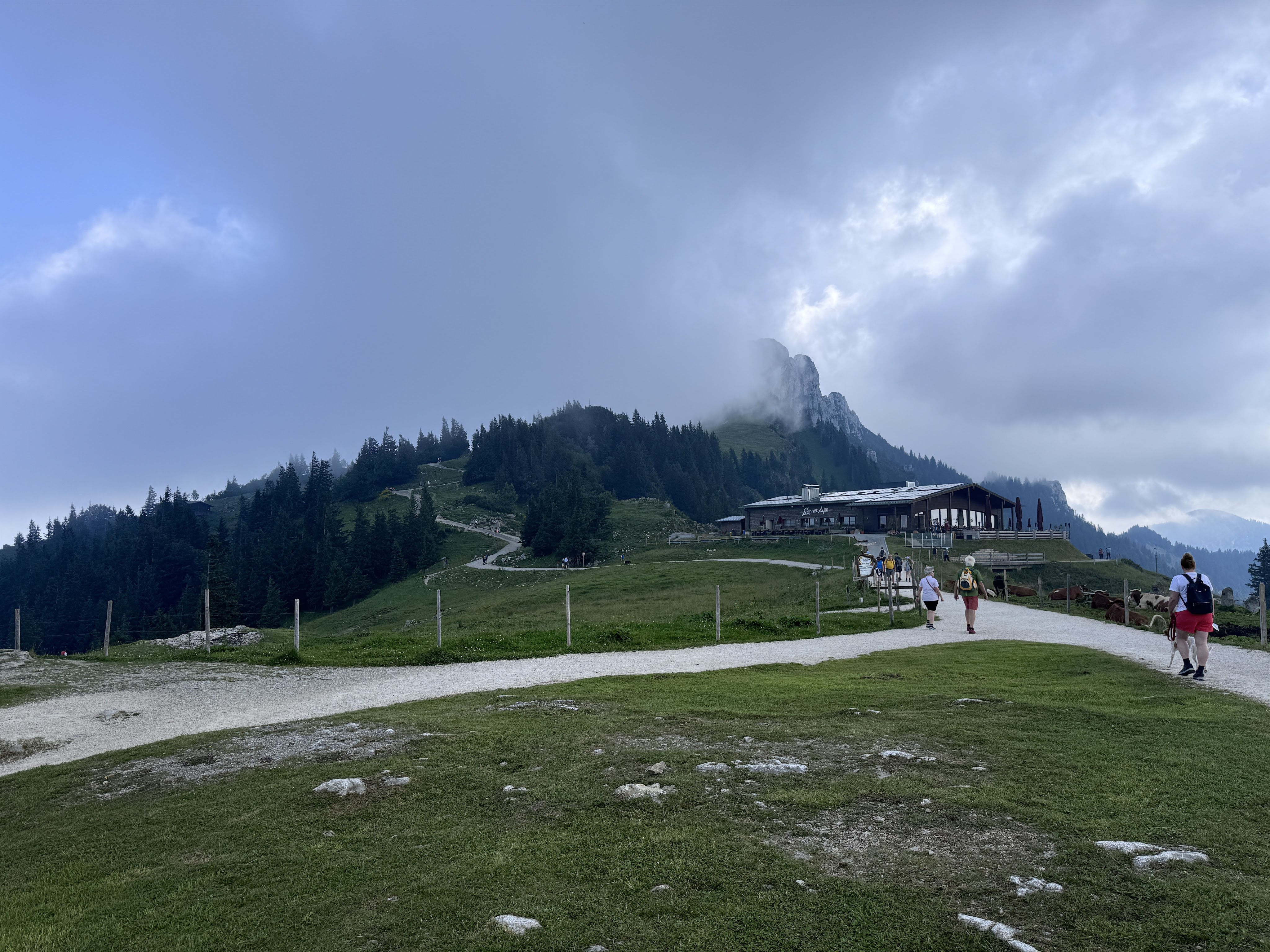 Oben, bei 1467 Metern Höhe angekommen empfängt uns zum einen eine etwas kühlere Luft und zum anderem ein grandioser Ausblick. Nach dem besuchen des Wellnessbereiches wandern wir drei mit der Begeleitung des Hundes dem Berg hinab. An grünen Wiesen vorbei. Es starten Paragleitflieger am Berg, Fahradfahrer fahren dem Berg hinauf. Mal mit Trittunterstützung mal ohne. Je mehr wir uns von der Bergstation entfernen, umso ruhiger wird es. Der Weg ist am Anfang asphaltiert, was zum Laufen nicht so prickelnd ist, biegt aber bald in den Wald ab. Der kleine Abschnitt täuscht allerdings, als wir wieder aus dem Wald heraus kommen erreichen wir die beiden Almen. Für eine Einkehr zu früh. Aber wir nehmen einen kleinen Snack zu uns. So wird der Rucksack schon mal leichter.