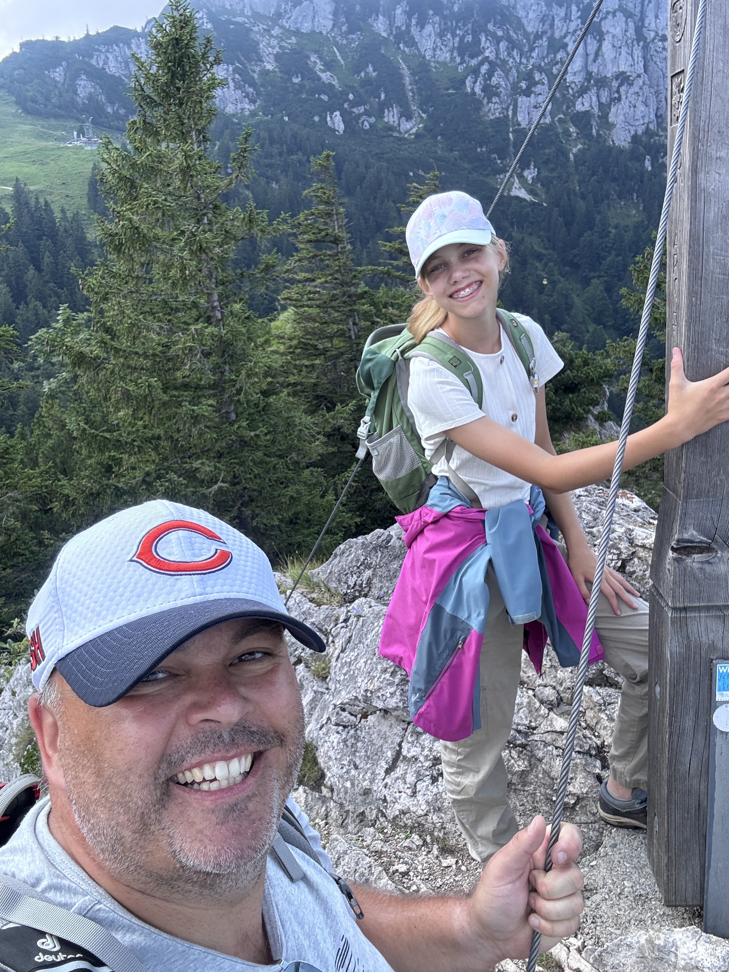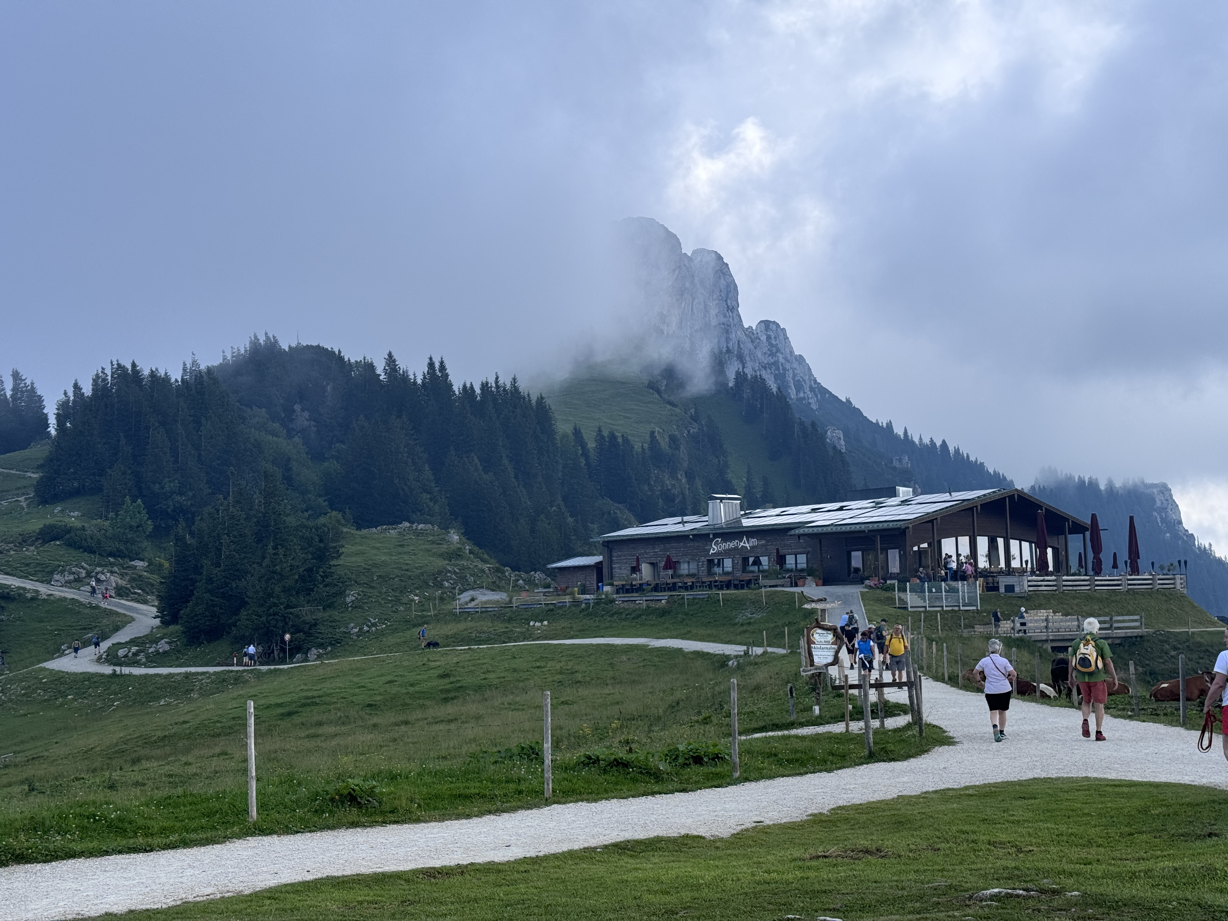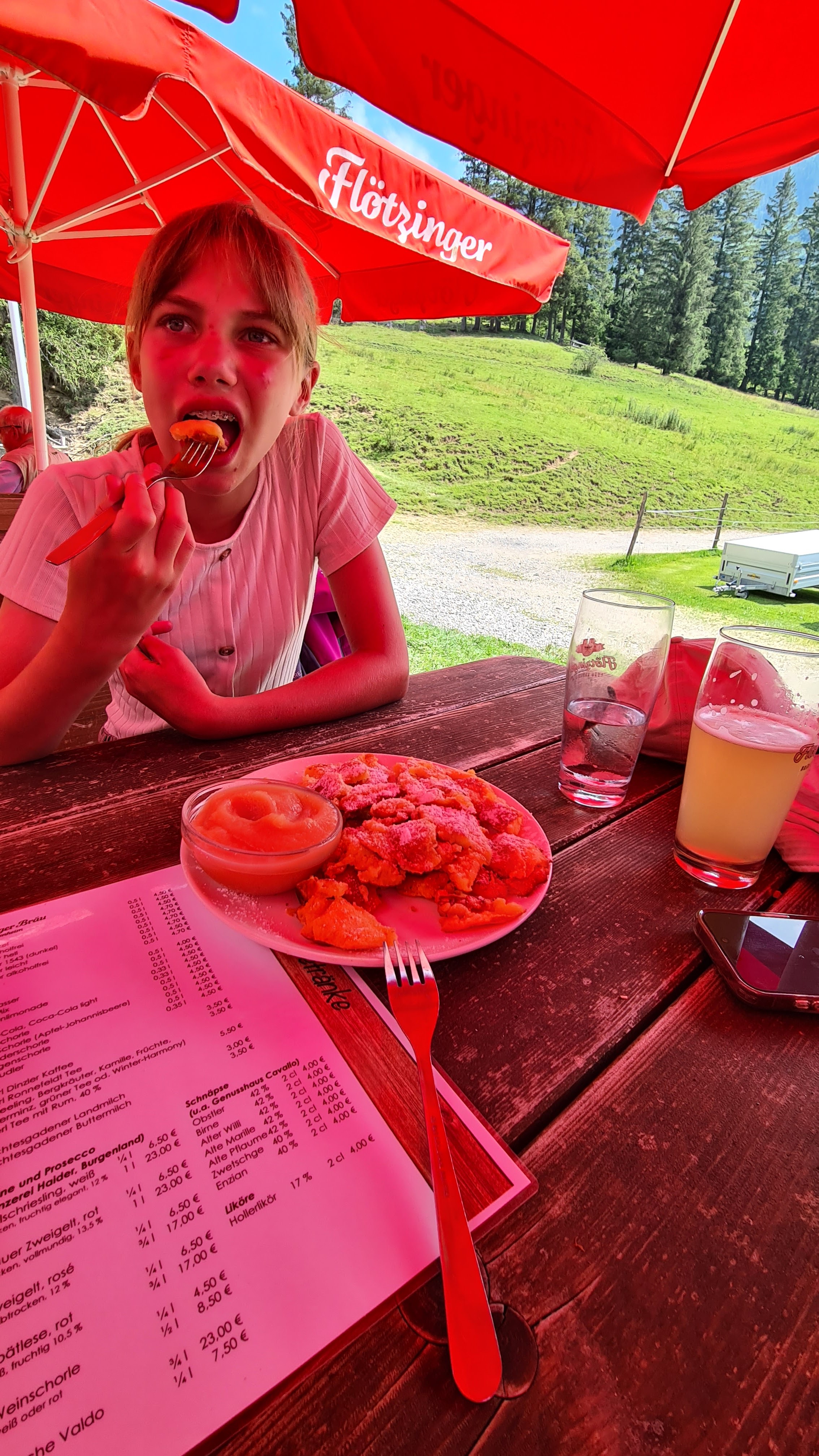 Nach wirklichen 35 Minuten erreichen wir die Alm. Musik hatte uns von der Alm schon von weitem begrüßt und anglockt. Wir nehmen Platz und schon steht die Bedienung bereit um unsere Bestellung aufzunehmen. Ein Radler, Eine Johanissbeerschorle und eine Zitronenlimonade. Marlena bestellt eine Familienportion Kaiserschmarrn. Ein Teller, drei Gabel. Ich noch eine Radler hinterher.