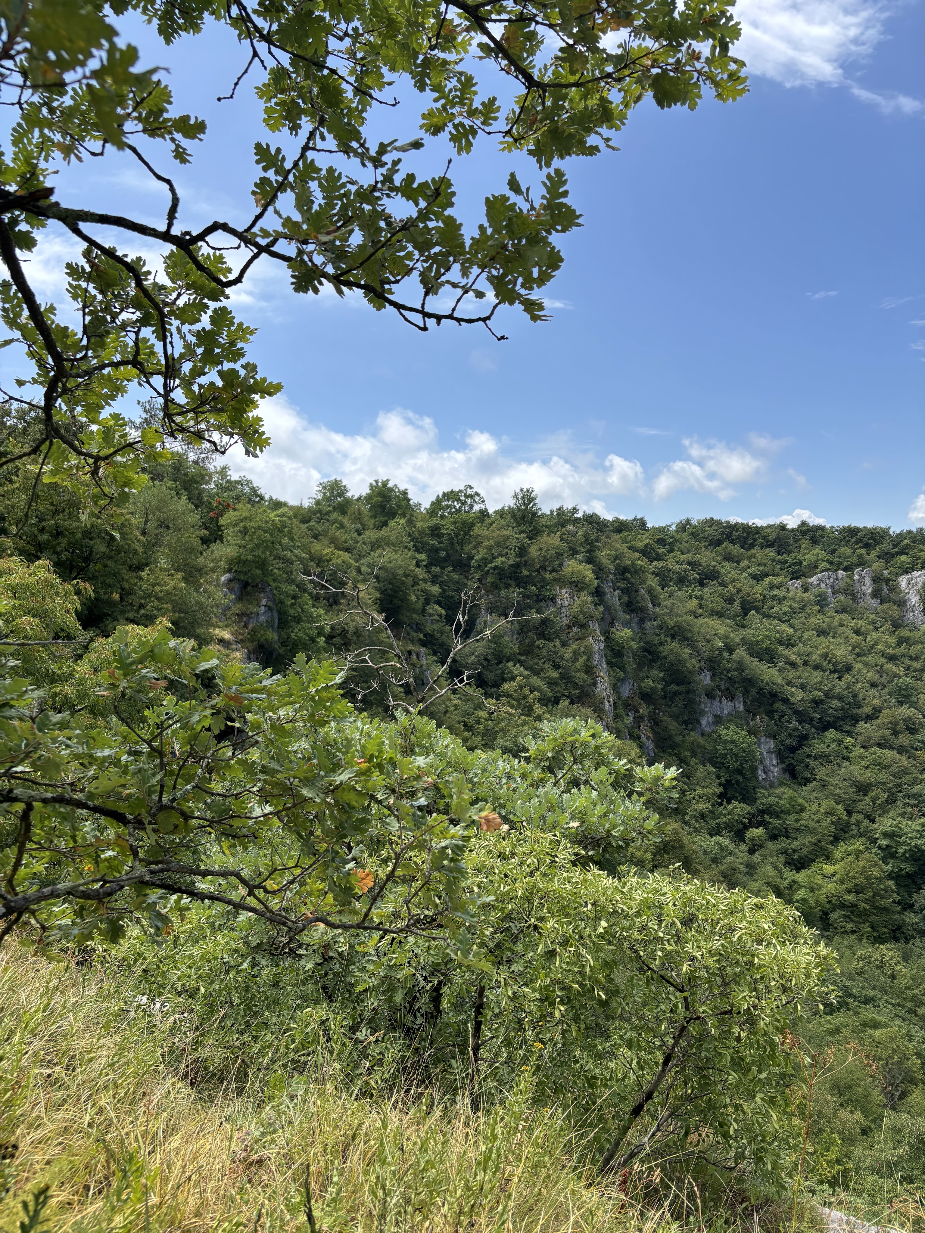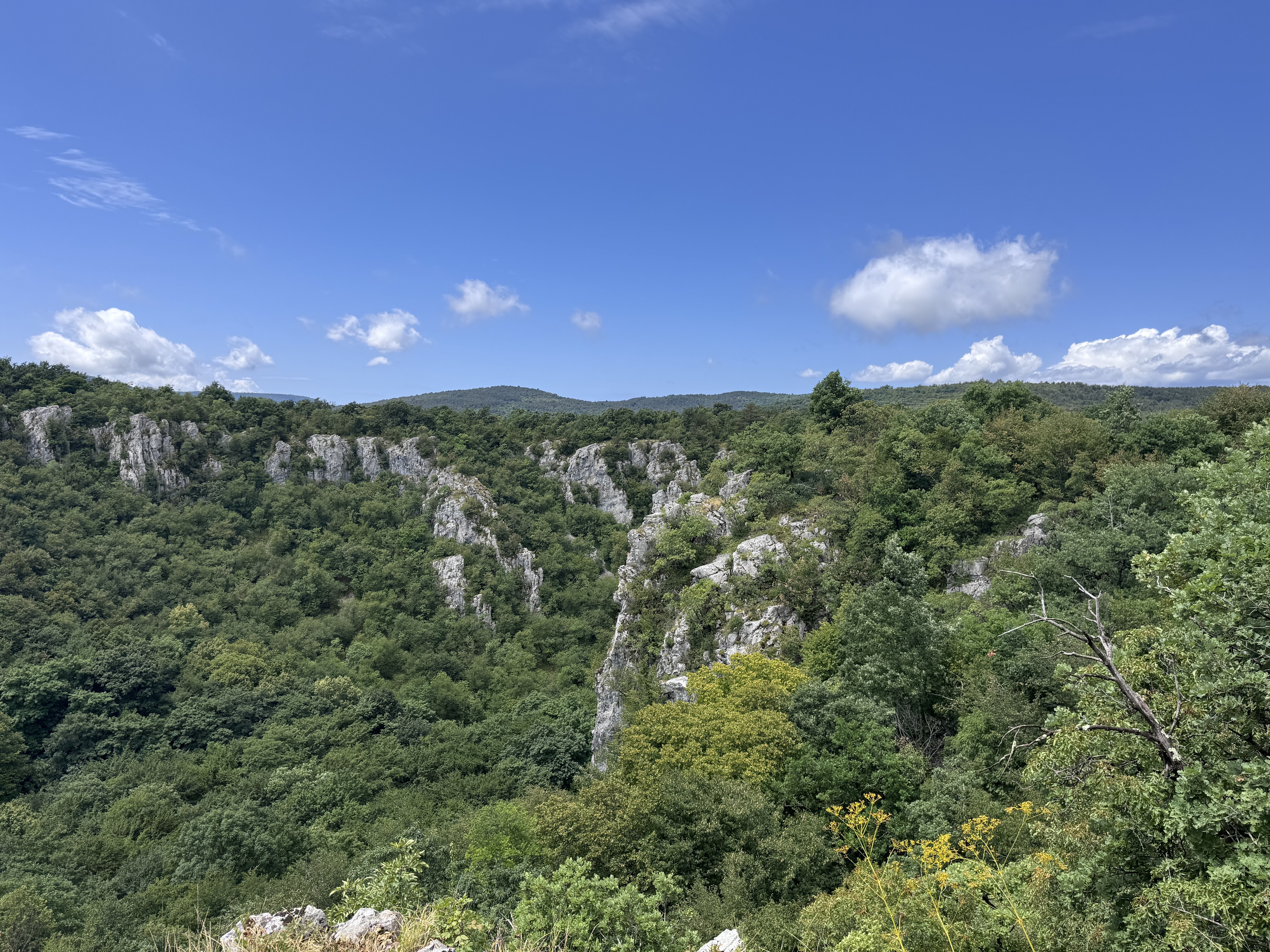 Wir mussten aber noch eine Nacht überbrücken bevor wir auf unseren Campingplatz durften. Ich hatte einen kleinen Stellplatz gefunden der ziemlich neu war (3 Jahre alt). Dort konnten wir entsorgen, versorgen und auch die Toilette konnte erneuert werden. Wir kamen gegen 11:40 Uhr auf dem Platz an der auch nur 10 Euro kostet und inklusive Strom war. Wir reservierten uns den Platz mit den Sitzbänken und dem Tisch und drehten noch, weil es früh war, einen kleinen Spaziergang im angrenzenden (National)-Park. dort sollte es eigentlich einen Rundgang geben, aber irgendwie war der nicht so ausgeschildert so dass wir uns erstmal verliefen. Nach einer Odyssee an einem Steinbruch entlang und an einer Landstraße kamen der Hund und wir wieder an dem Wohnmobil an. Erschöpft sanken wir in unsere Stühle und sonnten uns. Am Abend grillten wir an unserem Platz und gingen zeitig ins Bett. In der frühen Nacht begann es wieder zu regnen an und auch Gewitter begleitet uns die ganze Nacht. Da es auch am nächsten morgen noch regnete, wurde ich mal wieder nass beim anhängen des Anhängers.