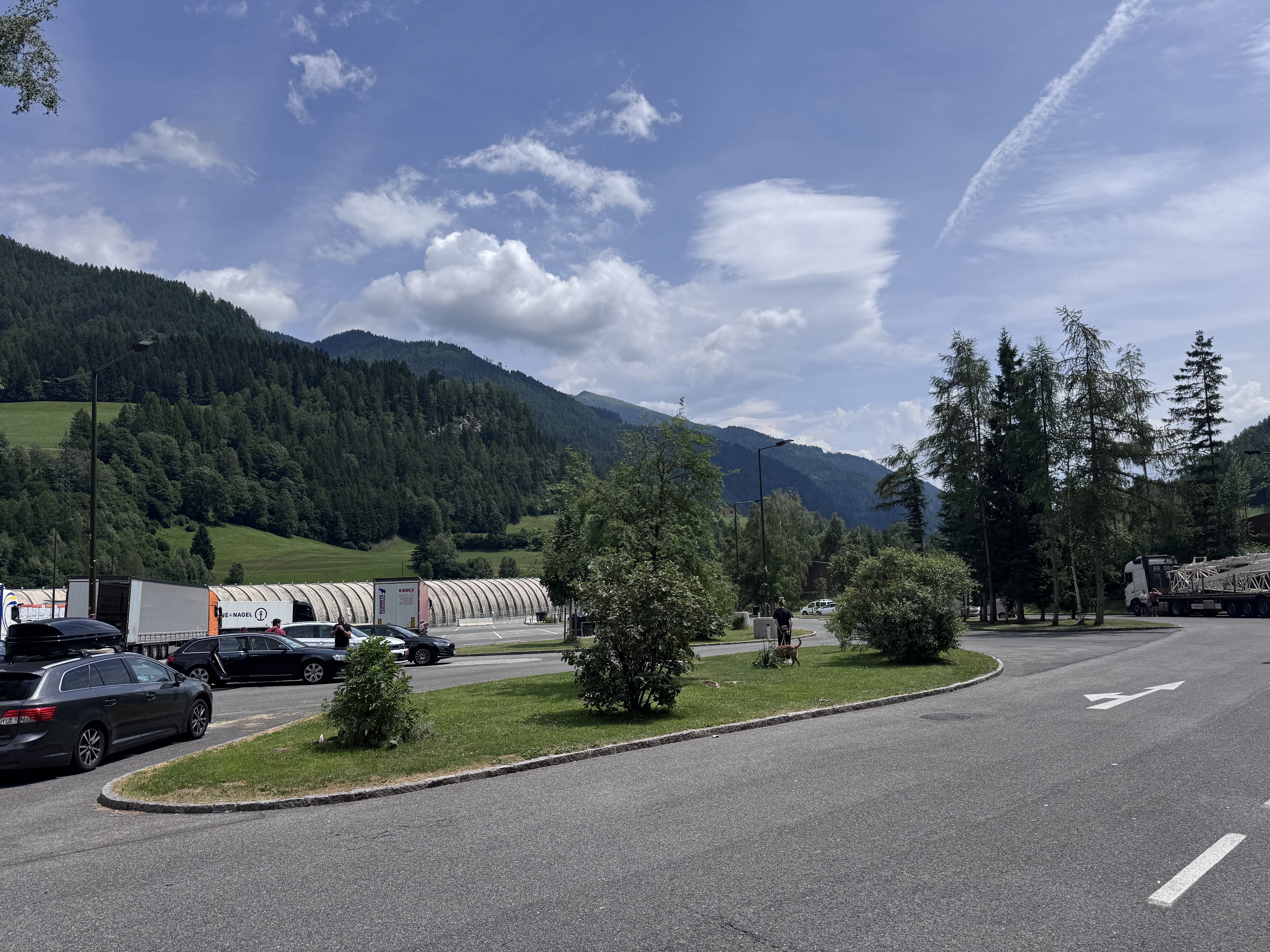 Selbst am morgen wurde es nicht weniger so dass ich ein wenig nass wurde beim Anhänger wieder anhängen. (Irgendjemand hatte meine Regenjacke aus dem Wohnmobil genommen). Da wir es wieder geschafft hatten, ziemlich früh loszufahren (07:30 Uhr) erreichten wir sehr schnell den Karawankentunnel und waren somit auch durch das gröbste durch. An (unserer) Tankstelle in Lesce haben wir wieder angehalten und getankt und dann gefrühstückt. Mittlerweile kostet der Kraftstoff an den Tankstellen an der Autobahn genausoviel wie die abseits der Autobahnen. Man spart also nicht mehr wenn man abfährt. 1 Liter Diesel kostete am 07. Juli 2025 1,48 €. In dem angrenzenden Gewerbegebiet haben wir dann noch ein wenig eingekauft. Dort gab es so ziemlich alle Läden die man braucht oder nicht braucht. Müller, Lidl, Hofer (Aldi), Tankstelle und so weiter.